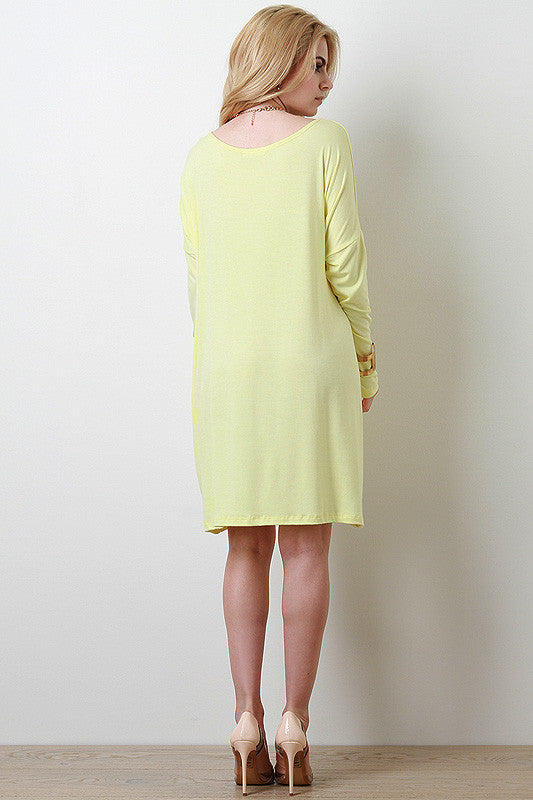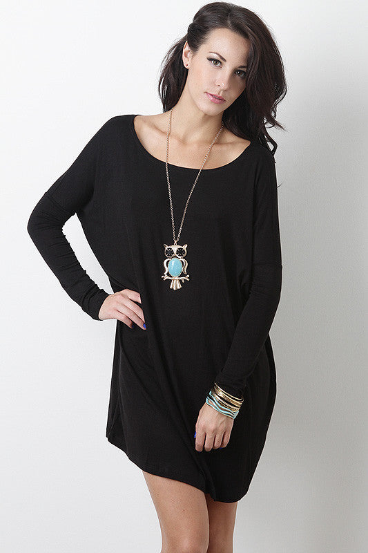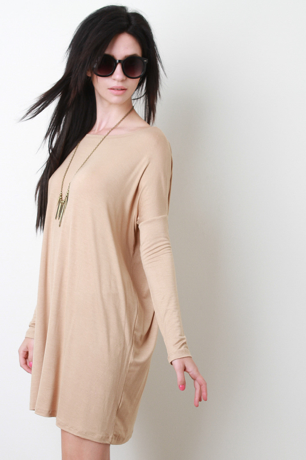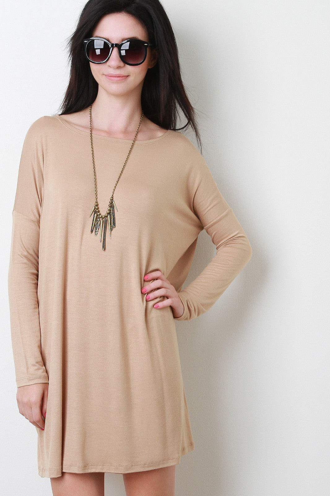 Keep your look casual with the Sweet Serenade Dress. This dress features soft stretch knit, boat neckline, long dolman sleeves, shift dress design, and finished with stitching detail. Accessories sold separately. Made in U.S.A. 95% Polyester, 5% Spandex.