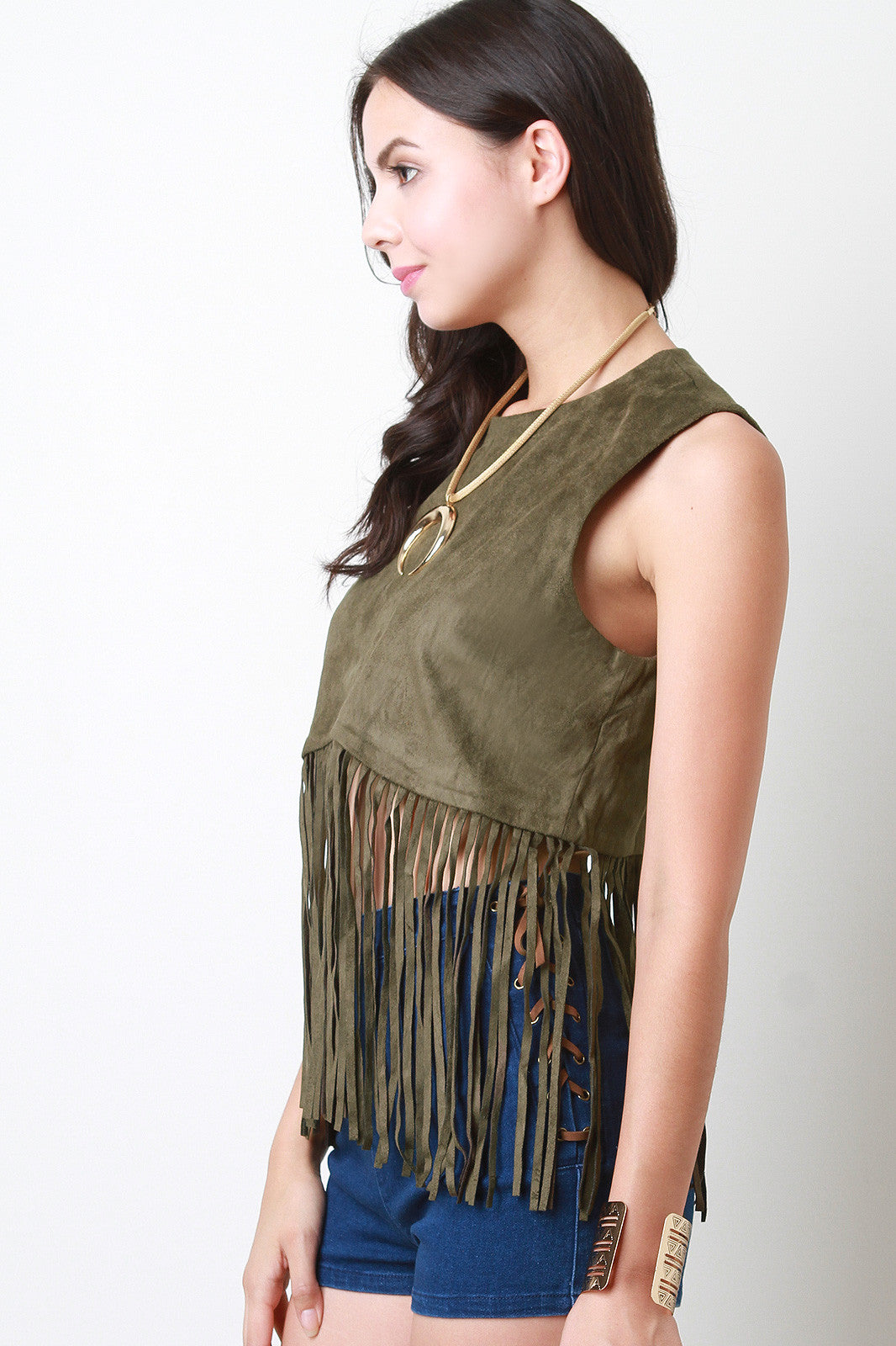 Featuring a round neckline, sleeveless ends, back zipper closure, and fringed hem. Accessories sold separately. 100% Polyester.