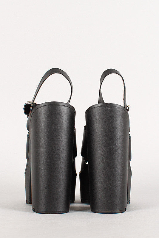 This statement-making lug sole platform heel features a peep toe, strappy leatherette design upper, and chunky platform heel. Finished with lightly padded insole and adjustable ankle strap with side buckle closure.