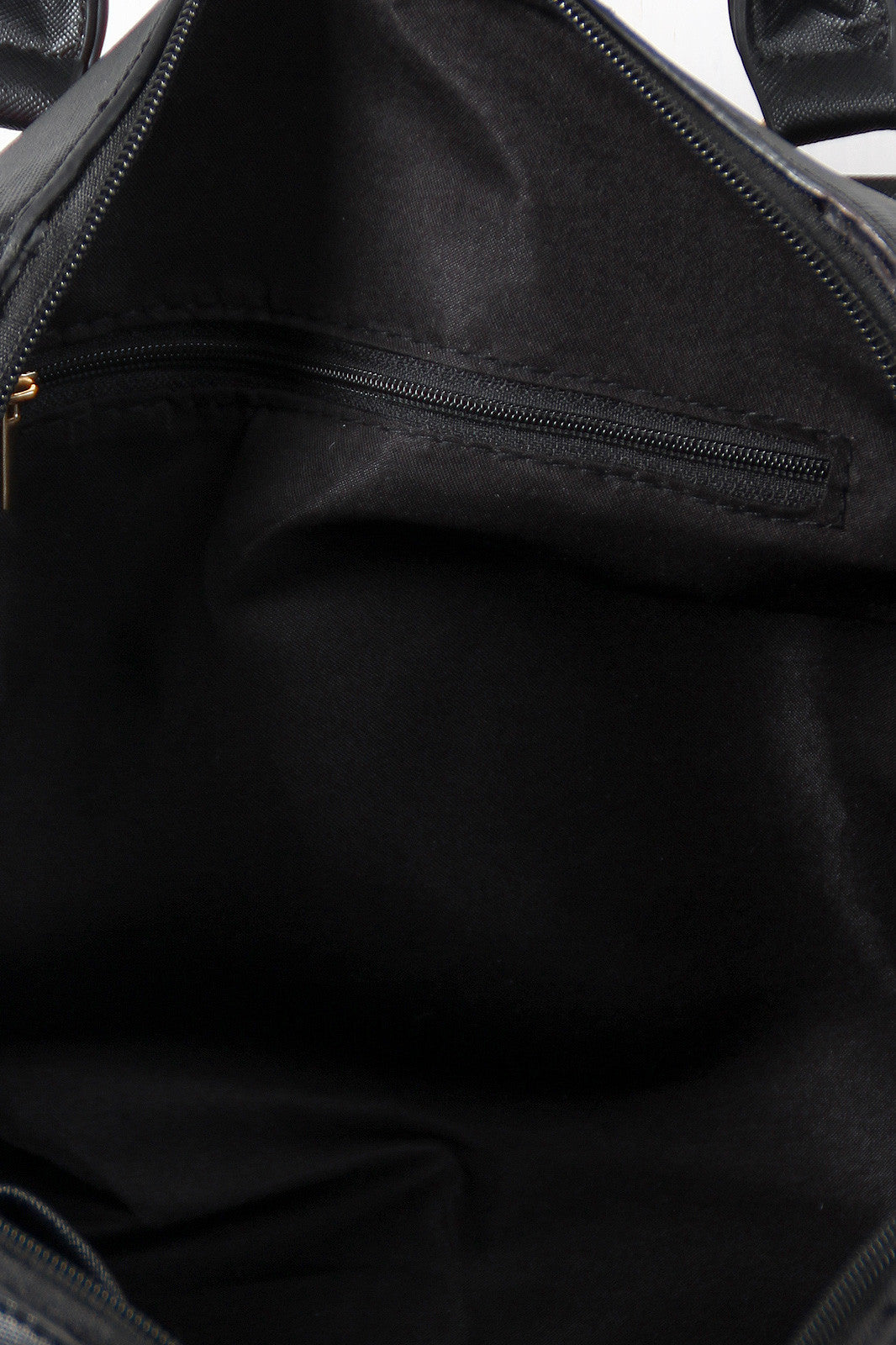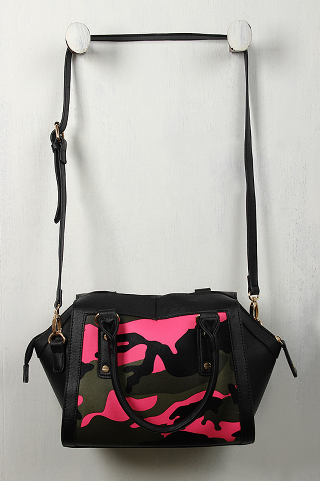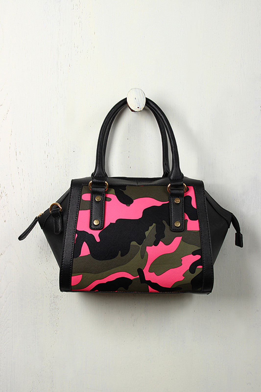 This attention-grabbing bag features a textured vegan leather and colorful camouflage print panels, pointed shape sides, and rounded handles with 5" drop. Complete with gold-tone hardware and studs, zipper closure, and fully lined interior with two slip pockets and one zipper pocket. Includes adjustable shoulder strap that attaches with lobster hooks.