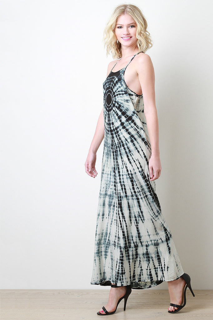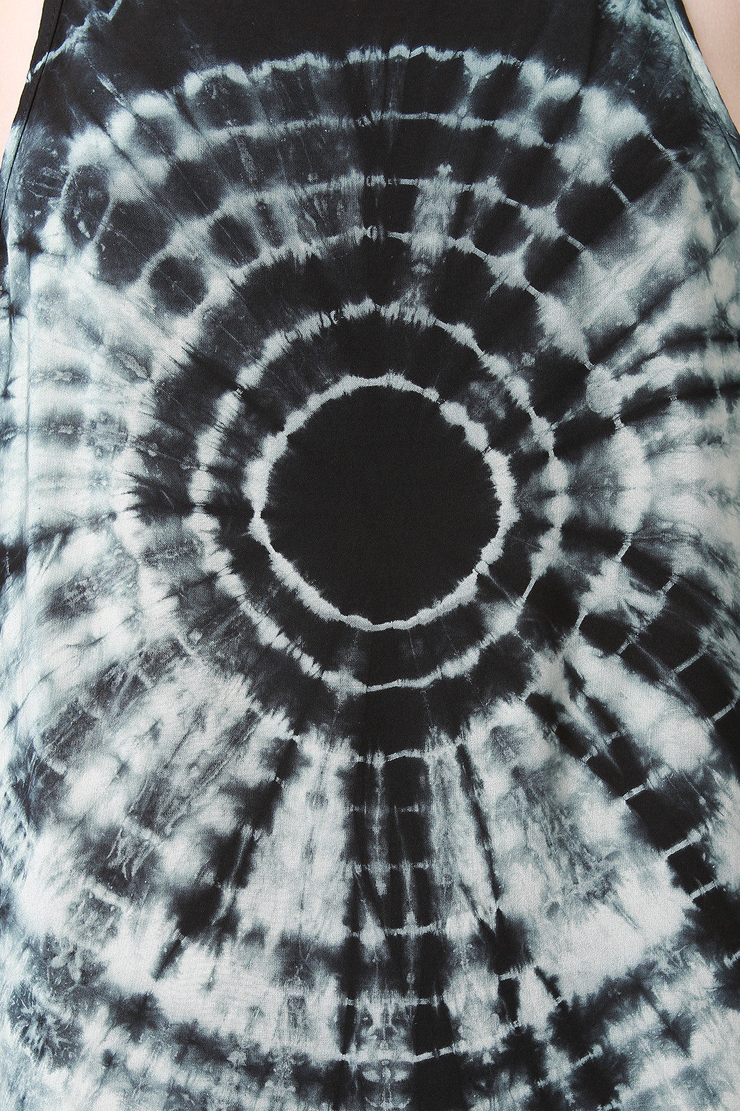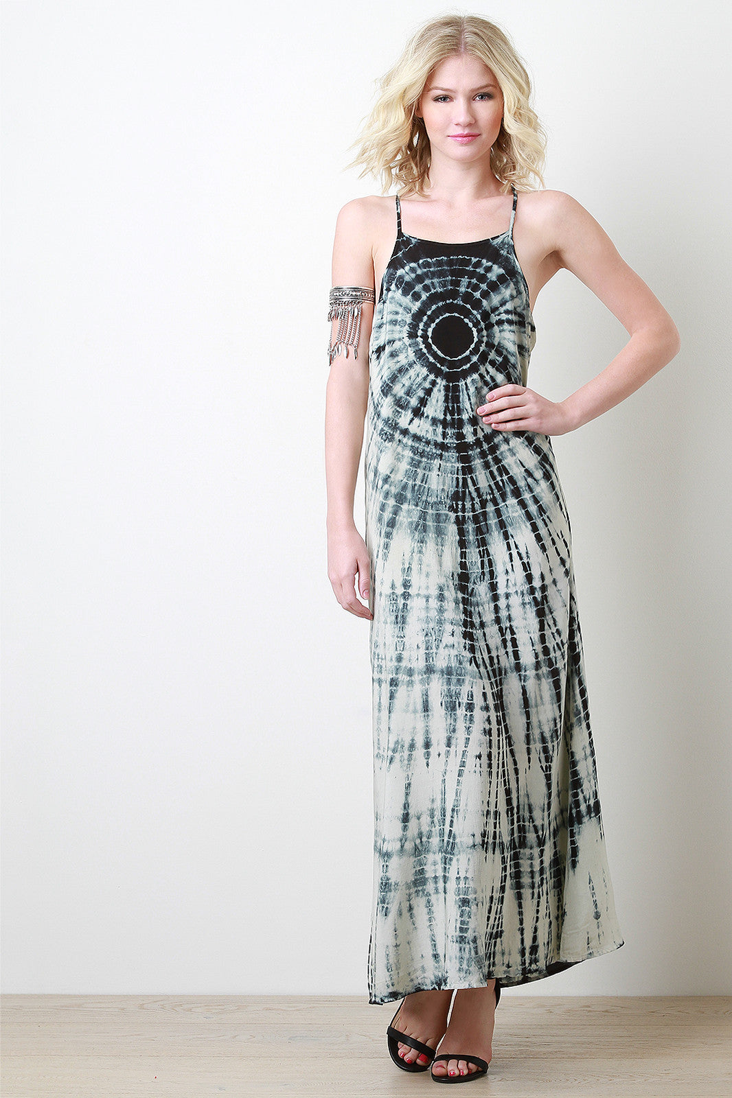 This sleeveless dress features a round neckline, spaghetti shoulder straps, racer back, casual fit, and tie dye pattern with a circle center at chest. Accessories sold separately. 100% Rayon.