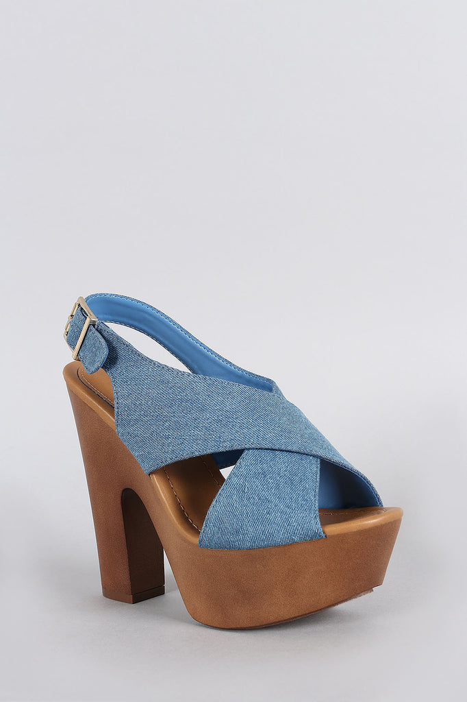 This eye-catching platform heel features a peep toe design, crisscrossing denim upper with slingback strap closure, and chunky faux wooden platform heel. Finished with lightly padded insole for comfort.