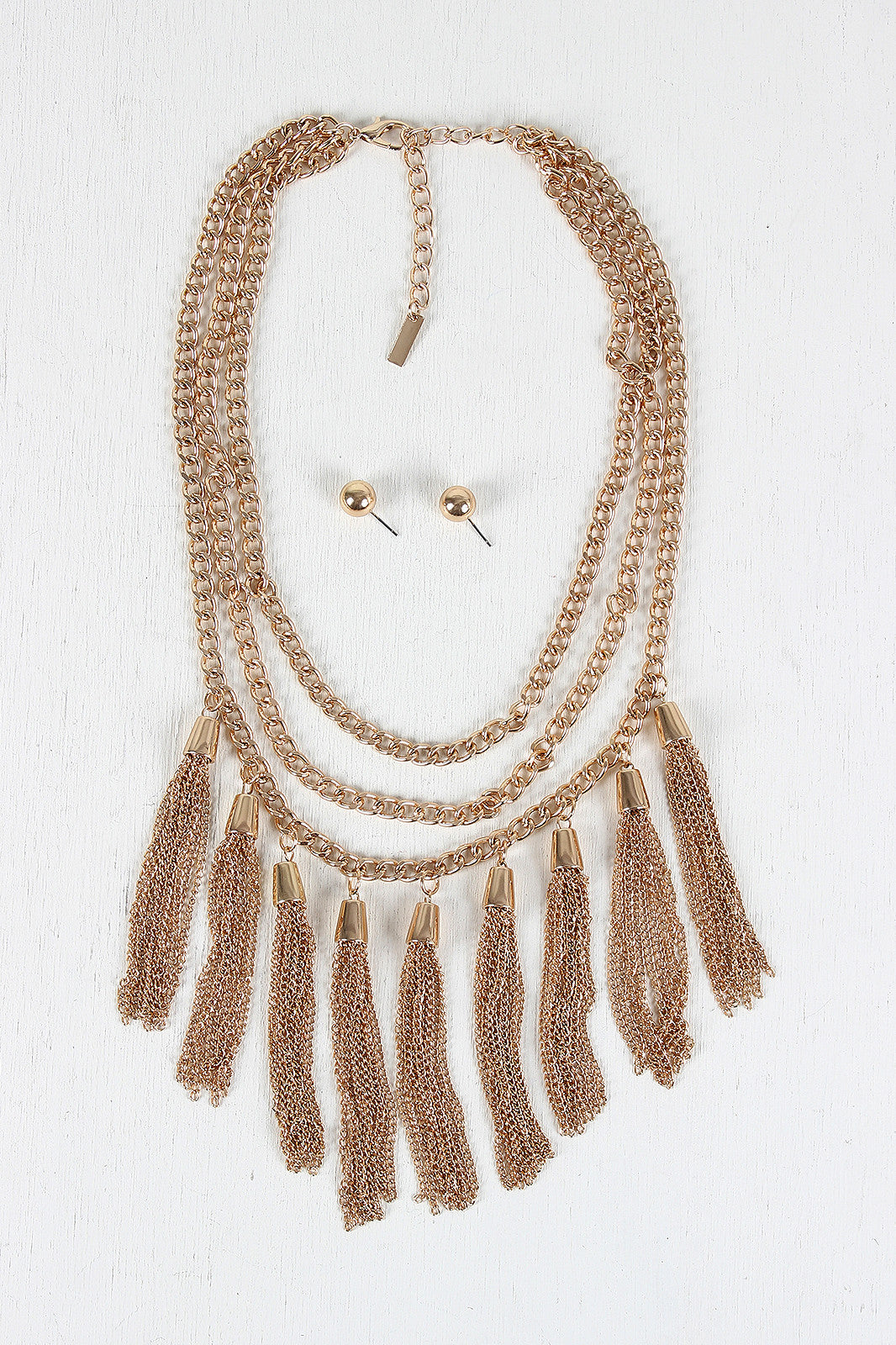 This necklace features three strands of glossy curb link chain, chain tassels, and adjustable lobster hook closure. Necklace includes matching earrings. Lead and nickel compliant.