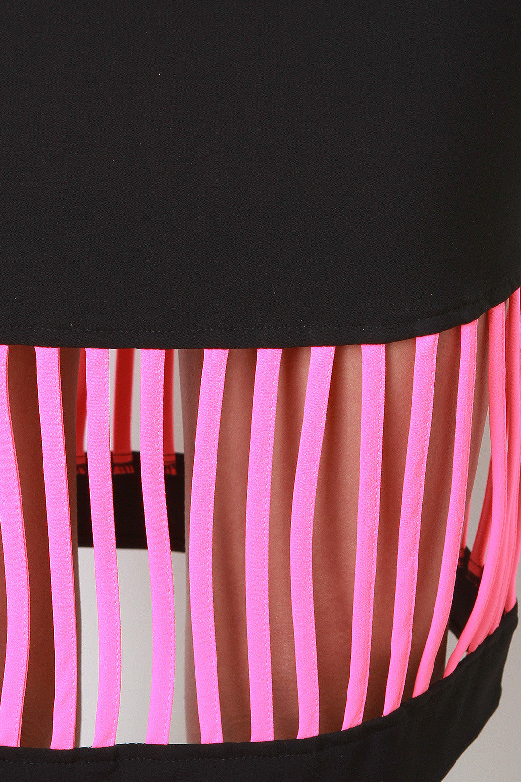 This skirt features a wide seam waist, hidden rear zipper fastener, neon strappy caged construction to a wide hemline. Accessories sold separately. 97% Polyester, 3% Spandex.