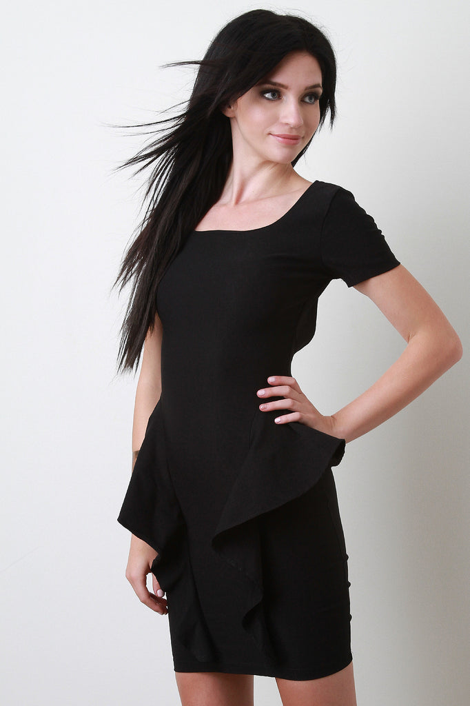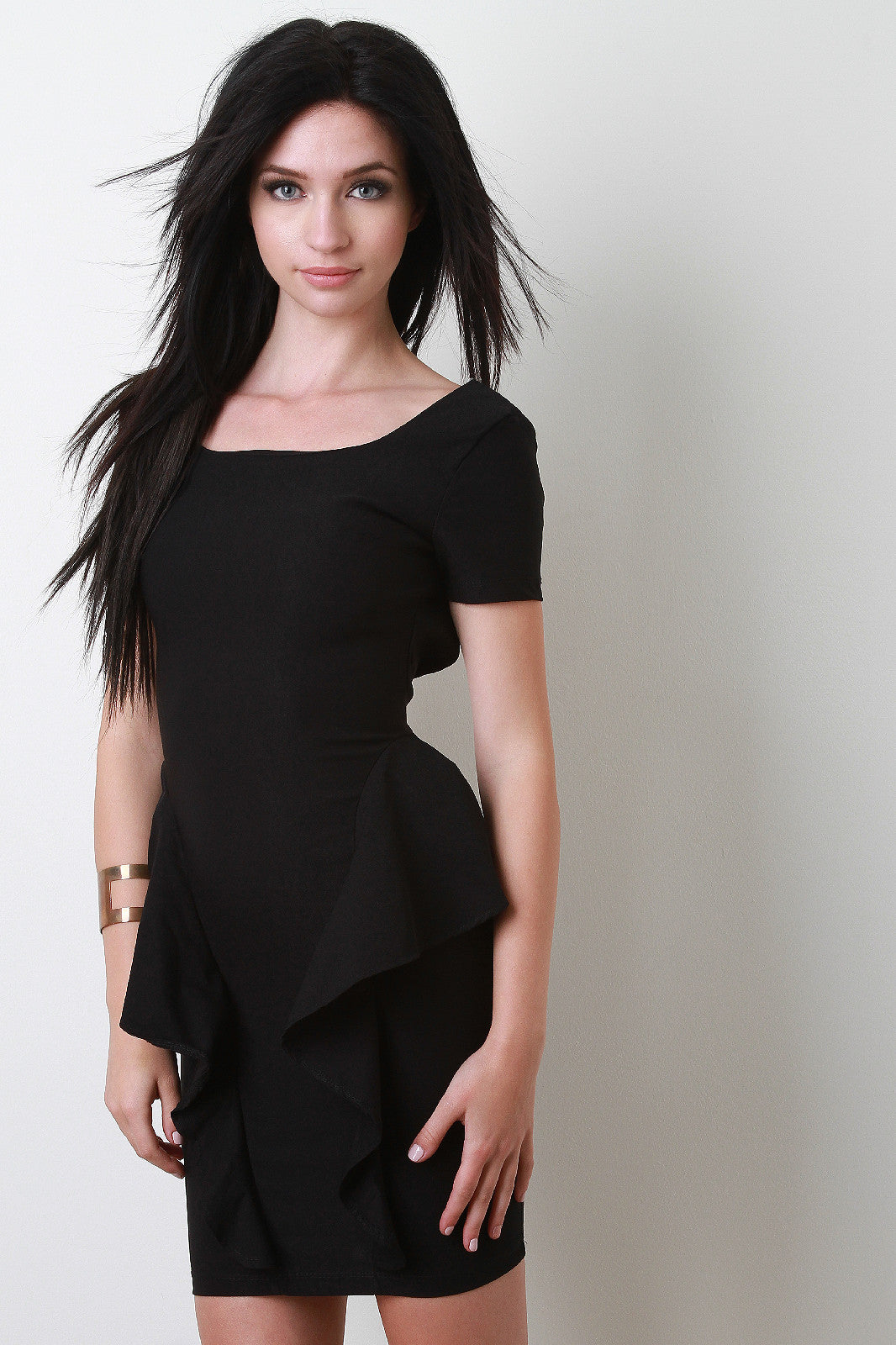 This bodycon dress features a round neckline, scoop back, cap sleeves, stretchy sculpture silhouette fit, side peplum ruffle tiers, and a zipper fastener at back. Accessories sold separately. Made in U.S.A. 74% Rayon, 22% Nylon, 4% Spandex.