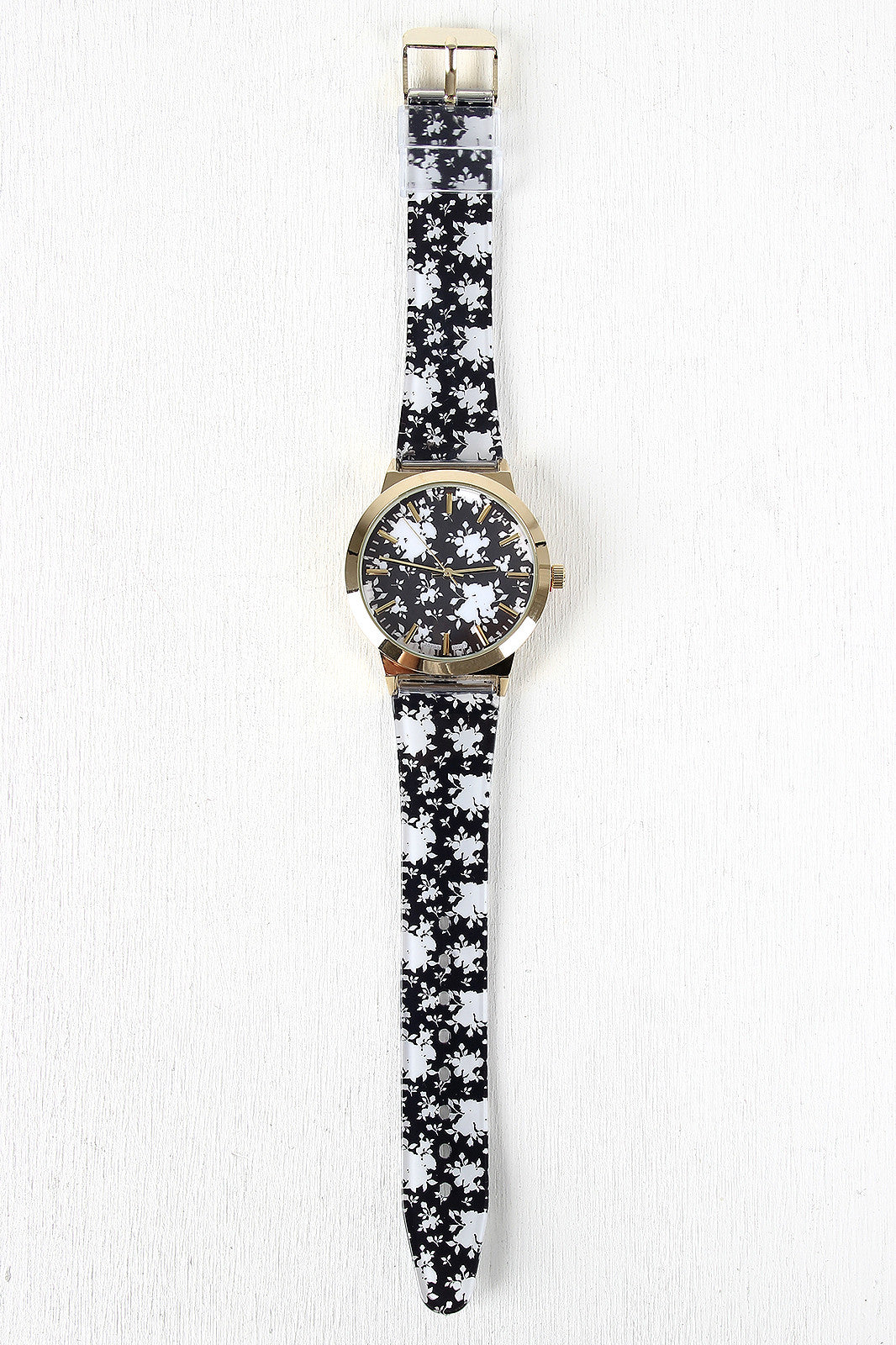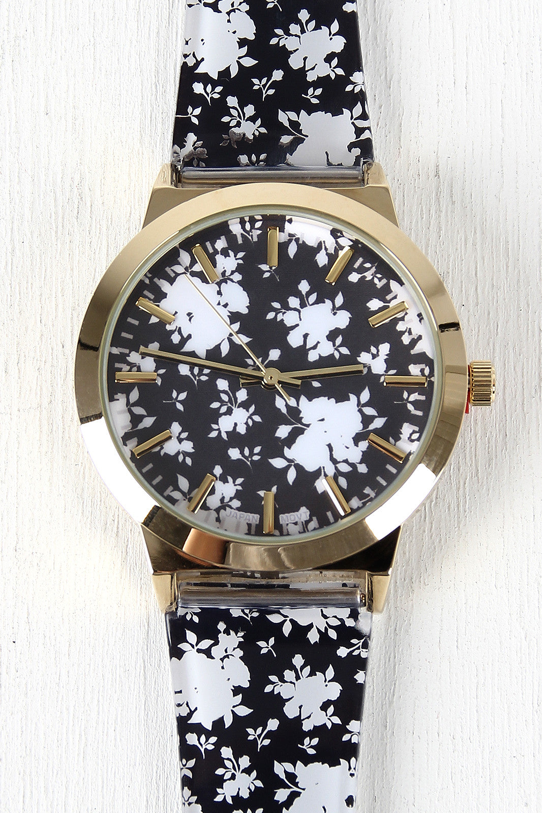 This watch features a glossy round bezel, rose silhouette patterned face with hour markers, and matching band with adjustable buckle closure.