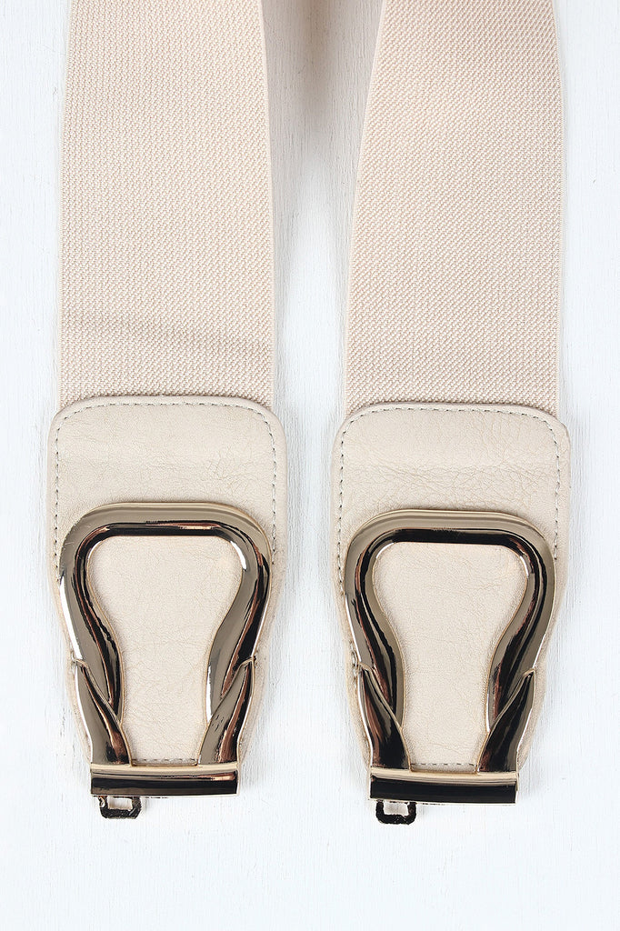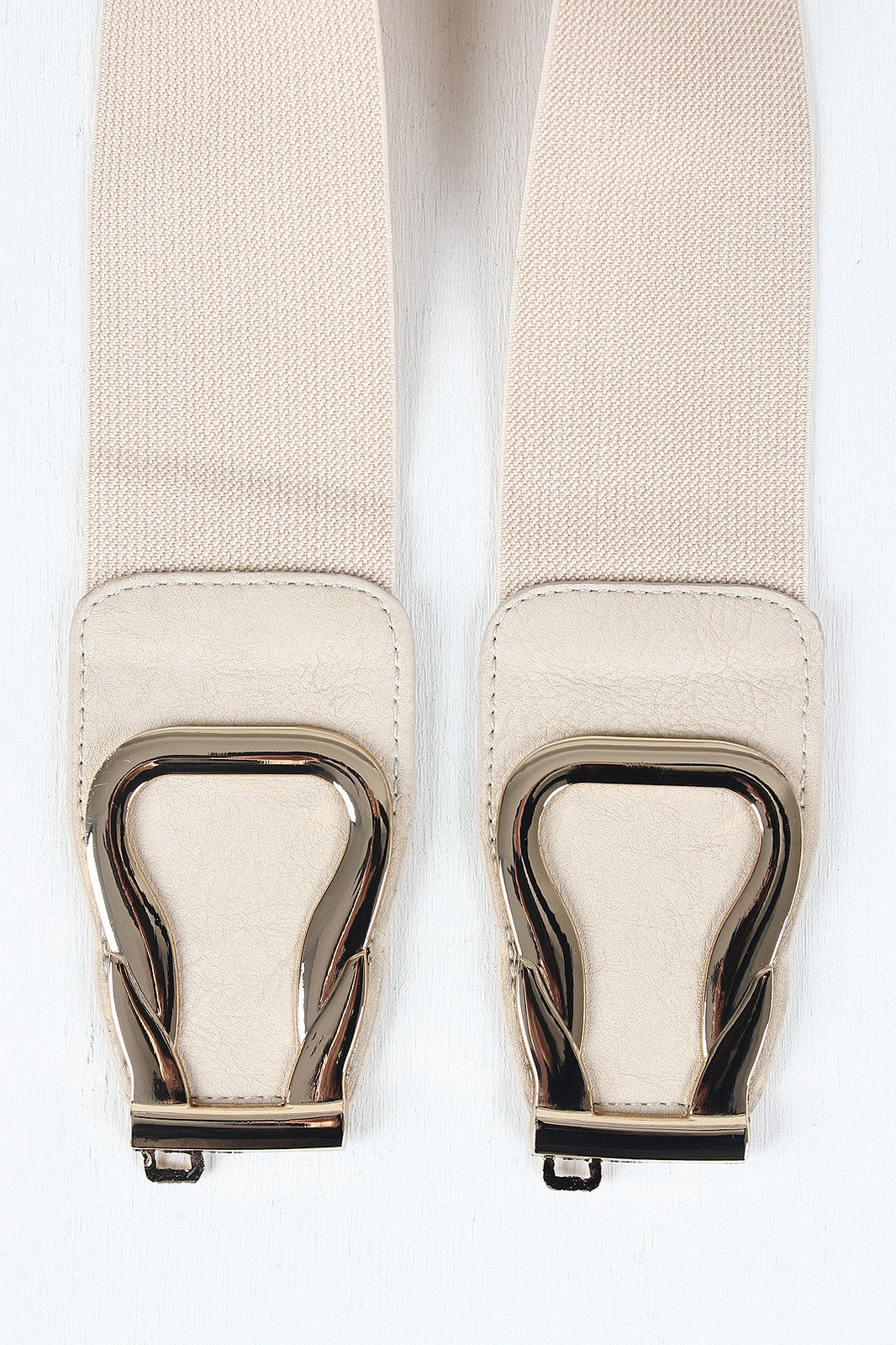 Belt with leatherette front, metallic stylized bow embellishment, and elastic main. Belt has two hook closures at front.