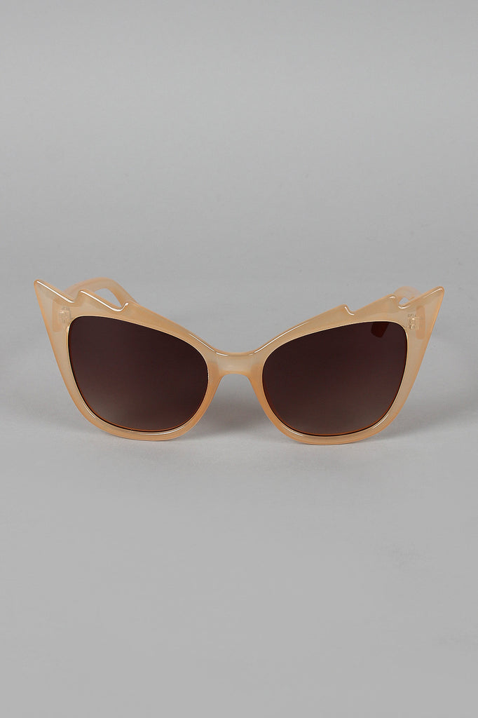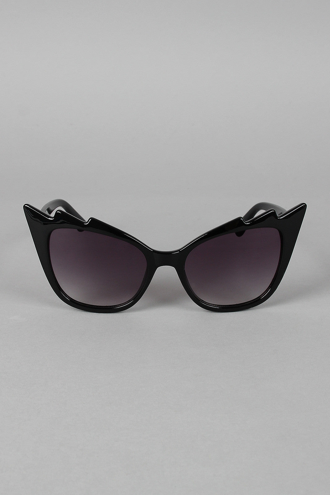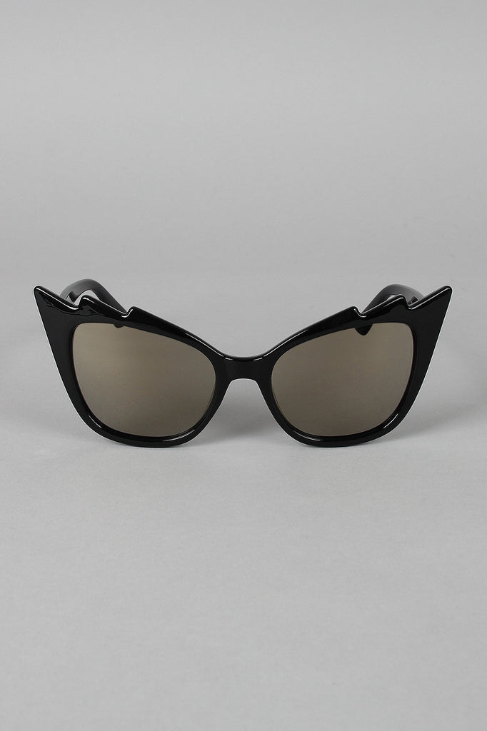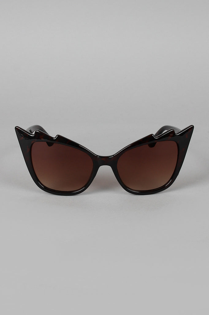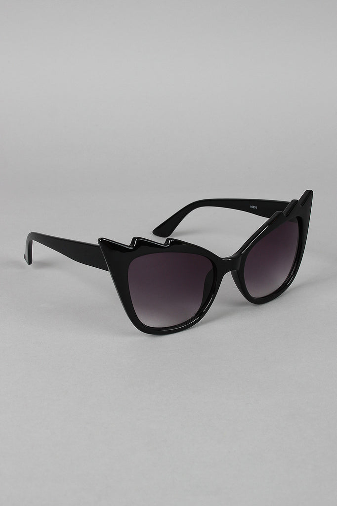 Statement sunglasses with spiked brow design, thick plastic frame, and tinted gradient lenses.