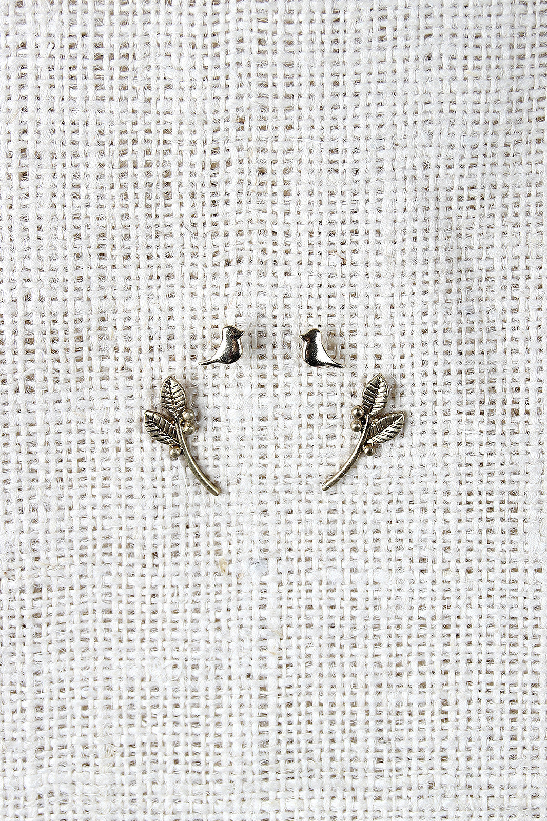 Earring set includes bird silhouette studs and leafy branch cuff earrings in glossy enamel. For pierced ears.