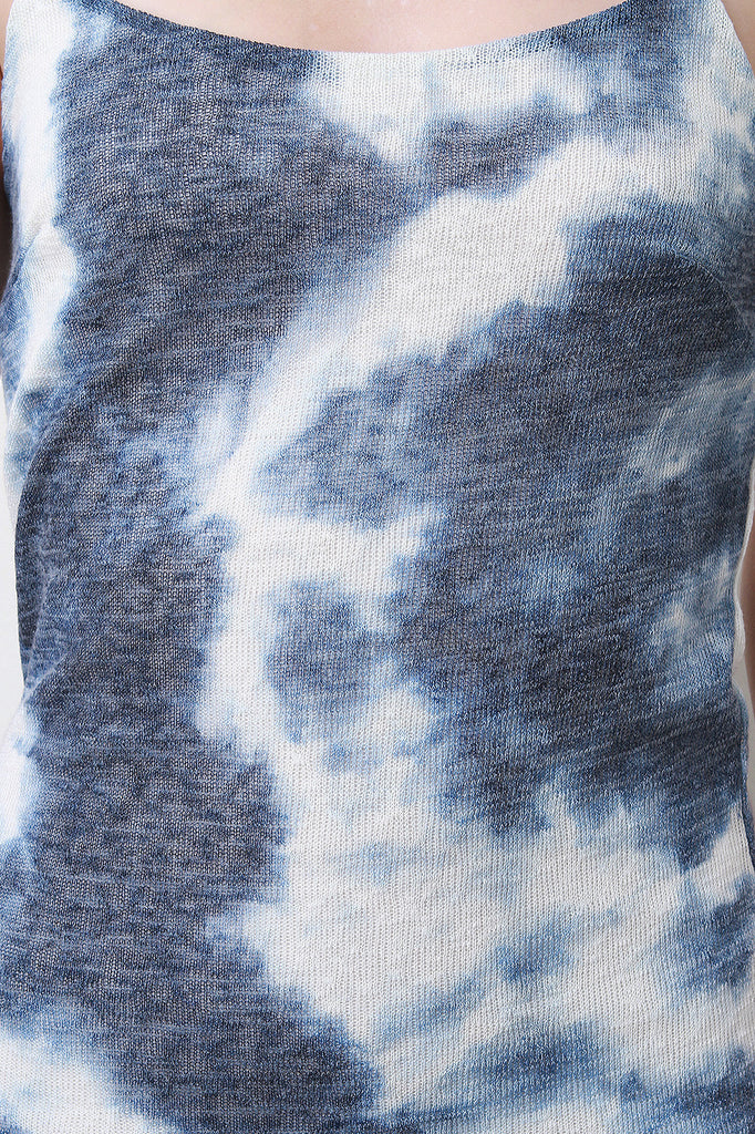 This maxi dress features a round neckline, sleeveless, double spaghetti shoulder straps to a crisscross back, loosely knit fabrication, tie-dye print, side vent slit, and shorter length underlay. Accessories sold separately. Made in U.S.A. 78% Polyester, 22% Rayon. Lining: 100% Polyester.