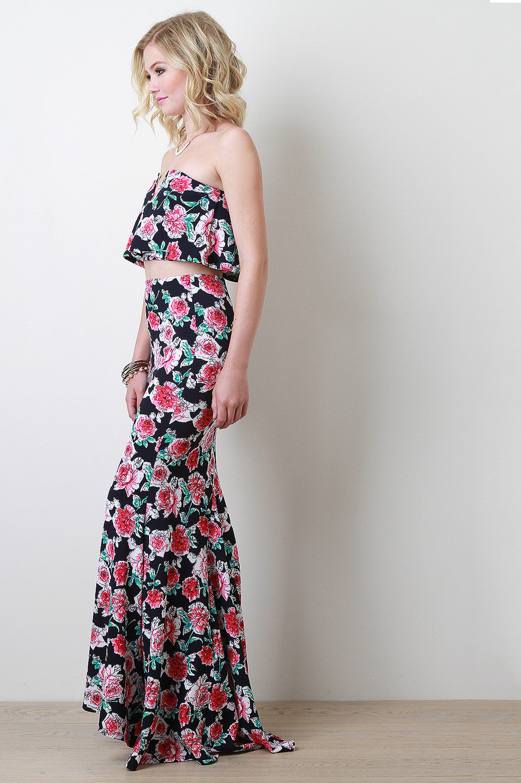 This  strapless  design with an elasticized band. Features a tube top underlay with a flowy overlay. Finished with V-neckline bonding.Designed with floral print throughout. Accessories sold separately. 96% Rayon. 5% Spandex.