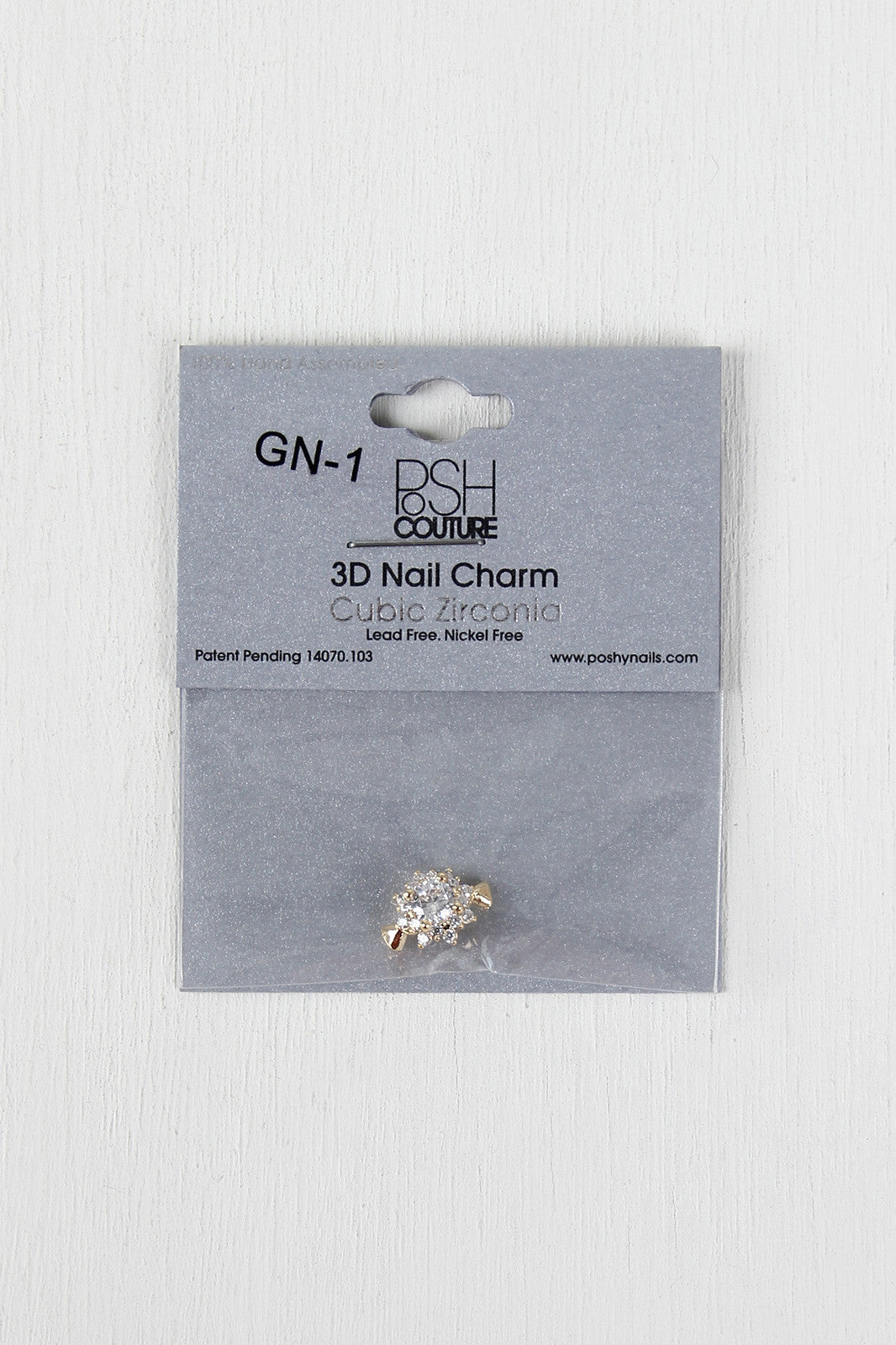 Nail charm featuring a flower shape constructed from rhinestones on a glossy gold-tone bezel. Charm is reusable, so mix and match for different looks!