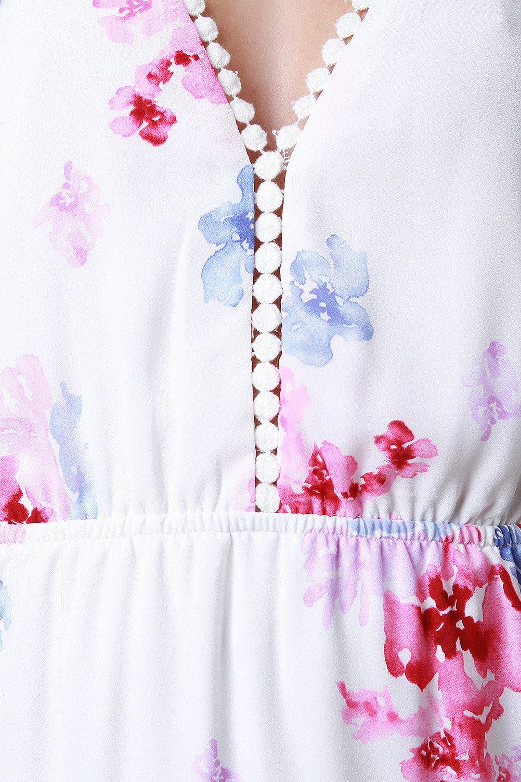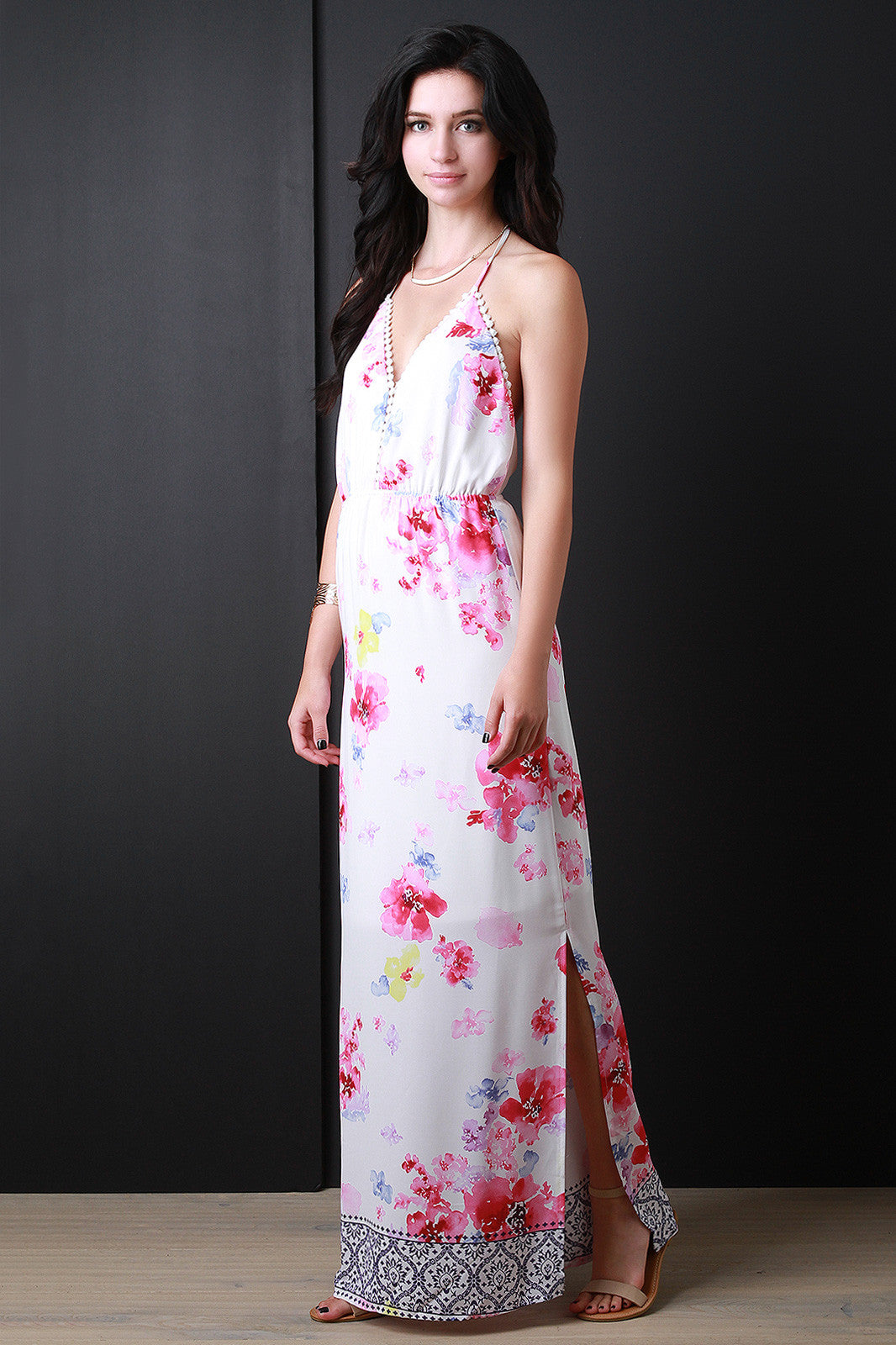 This floral design throughout with a paisley trim. It is halter necktie structure with a crochet trim. Finished with side slits. Accessories sold separately. 100% Polyester.