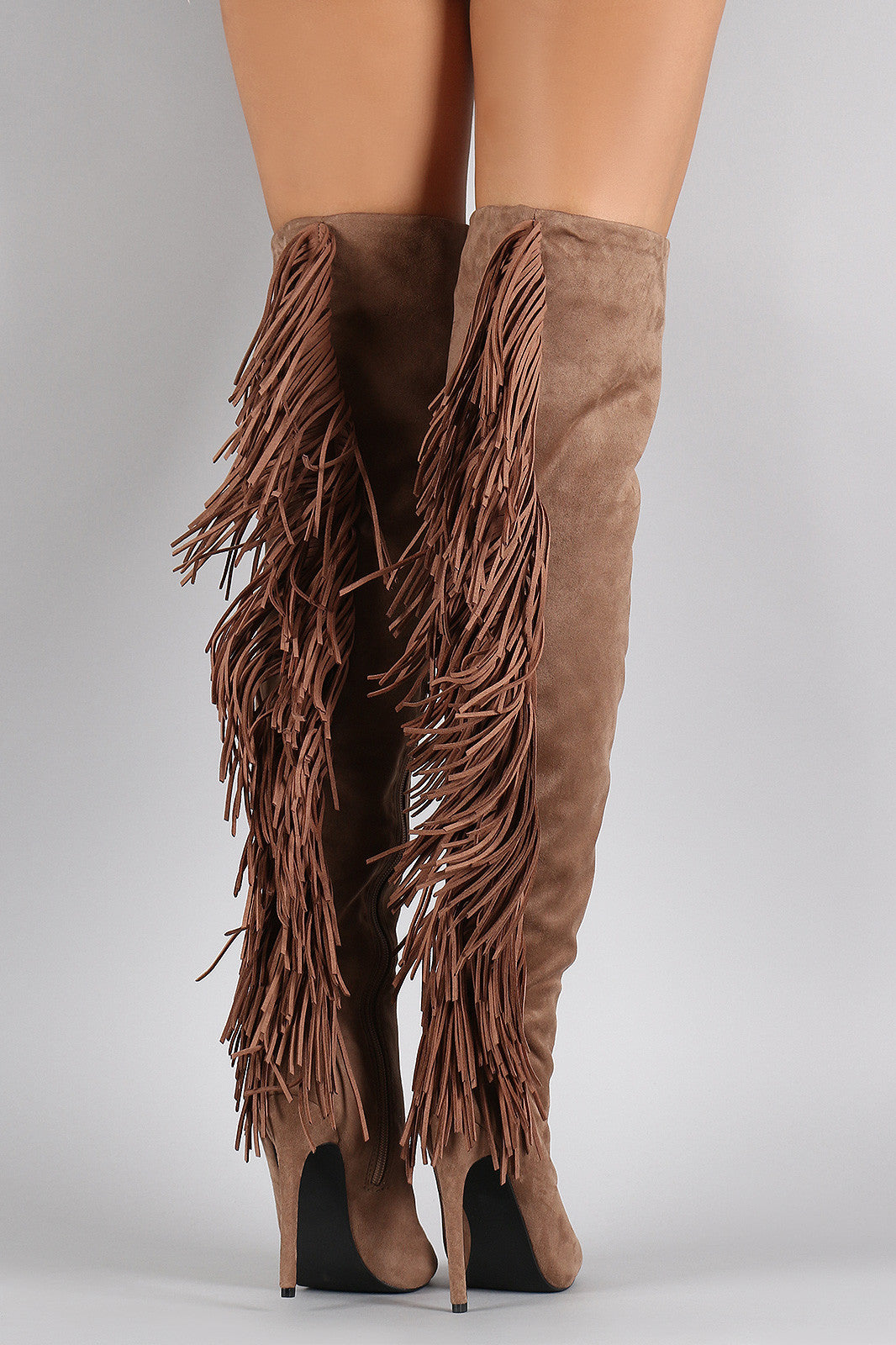Privileged Suede Fringe Peep Toe Stiletto Thigh High Boot