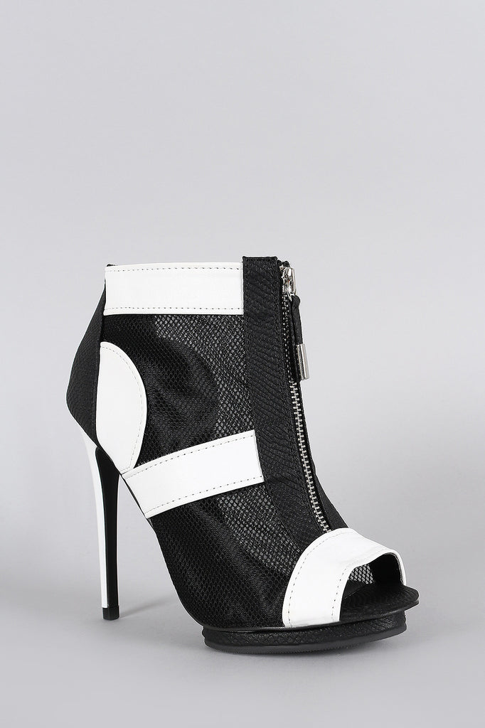 This booties features a semi-sheer mesh with snake embossed vegan leather panels, peep toe silhouette, low architectural platform, and stiletto heel. Finished with cushioned insole and front zip-up closure for easy on/off.