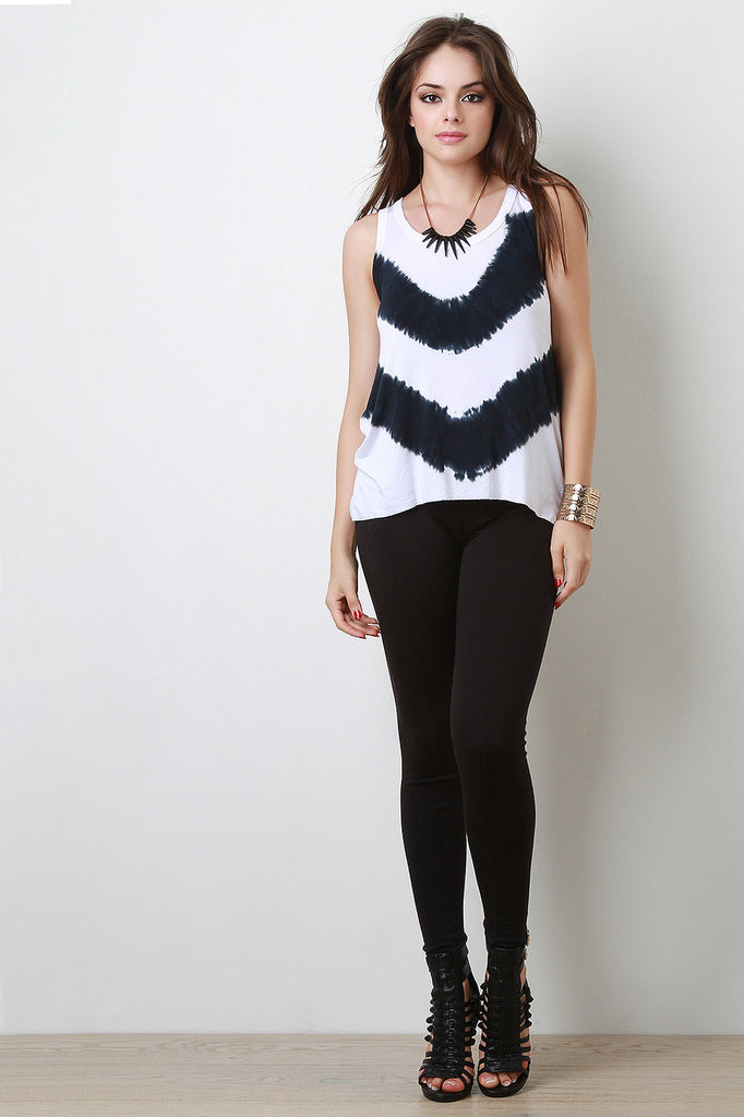 This casual tie dye print, round neckline, sleeveless design, and high low hemline. Accessories sold separately. Made in U.S.A. 96% Rayon, 4% Spandex.