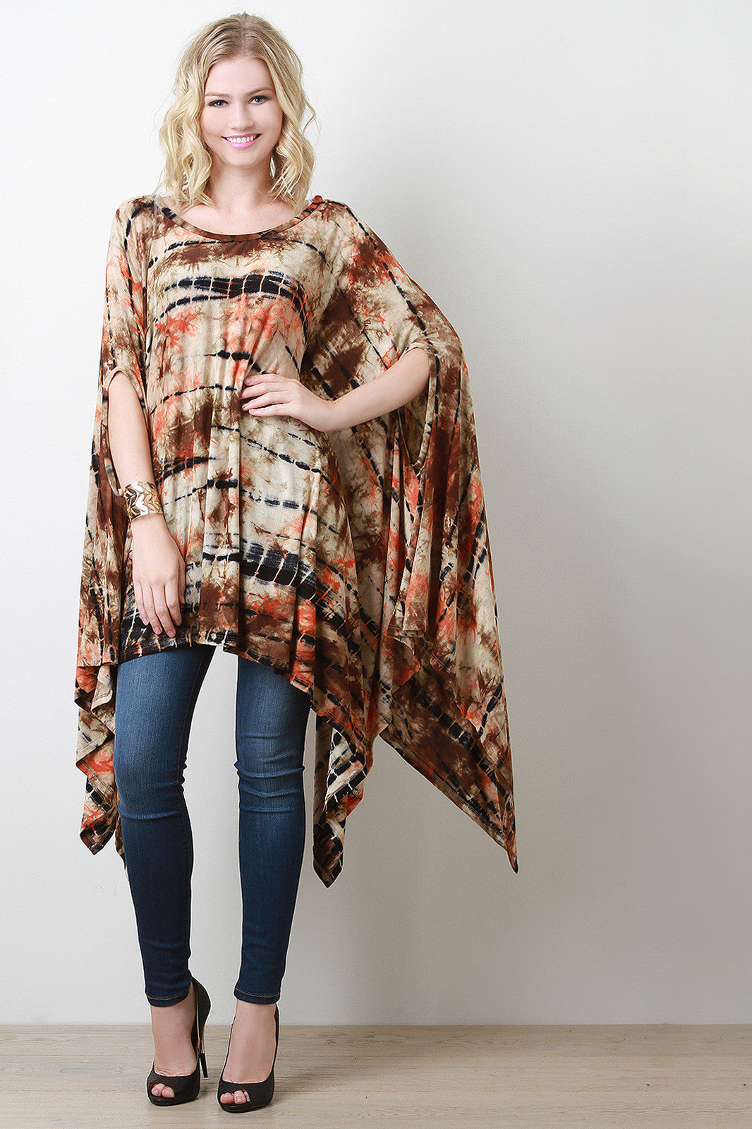 This poncho top features tie dye knit, round neckline, dropped shoulders, and finished with handkerchief hemline. Accessories sold separately. Made in U.S.A. 95% Rayon, 5% Spandex.