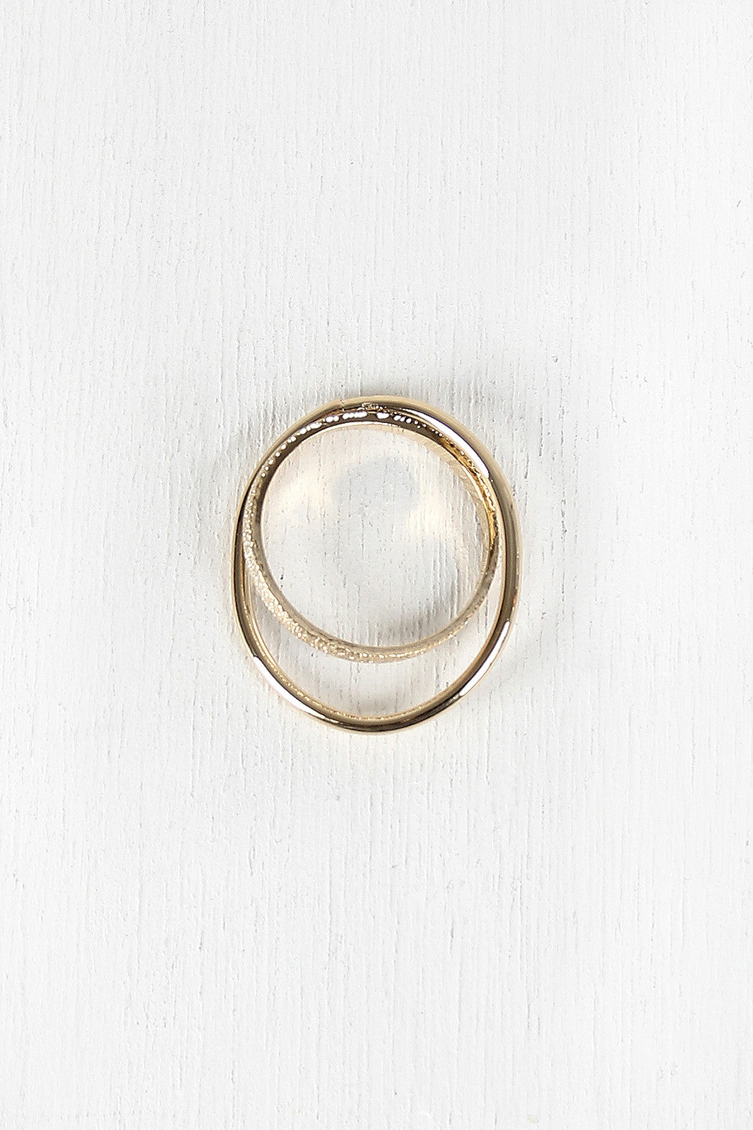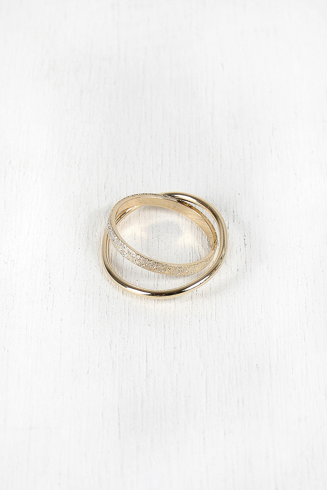 Ring features a glossy loop and a sanded-texture loop in a rolling rings design. Loops are attached at a fixed point and are non-adjustable.