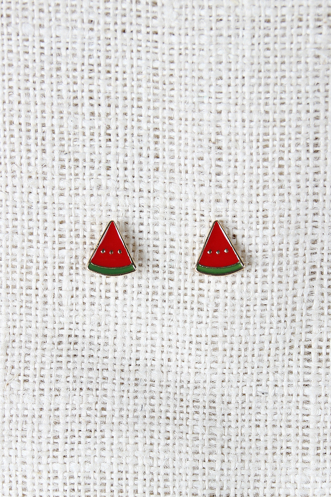 Stud earrings featuring a watermelon slice design in glossy enamel with post backs.