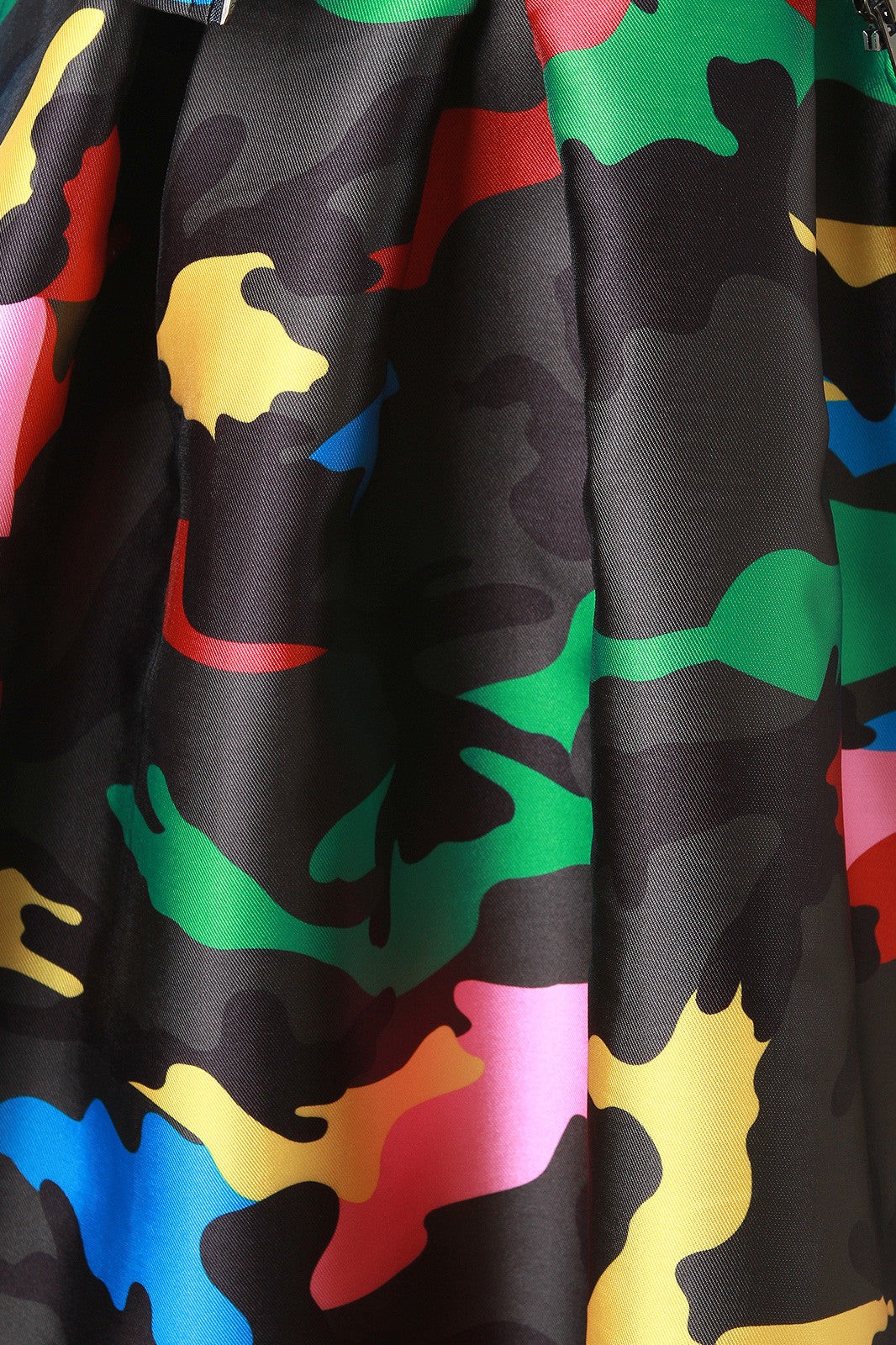This A-line midi skirt features a wide elasticized waist, zipper fastener back, boxy pleated construction, colorful camouflage pattern print, and underlay. Accessories sold separately. 100% Polyester.