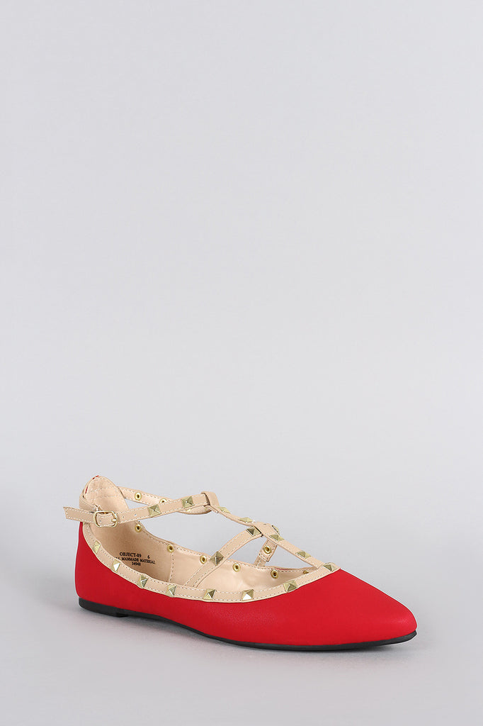 This ballet inspired pointy toe silhouette with a t-strap inspired caged vamp. Finished with pyramid studs throughout the vamp.