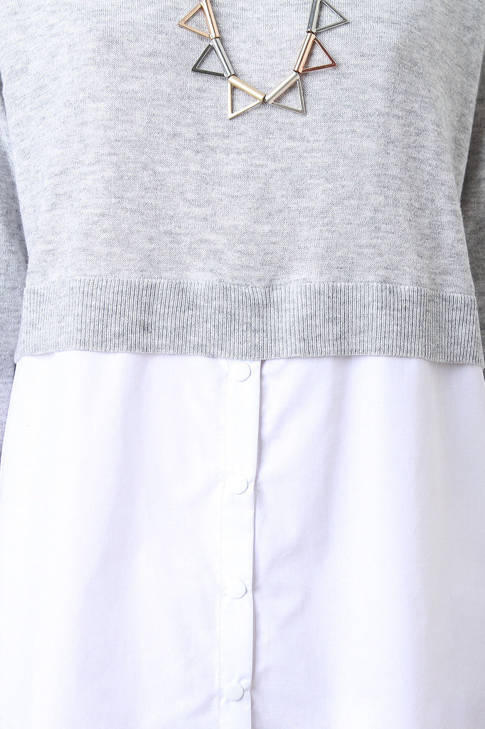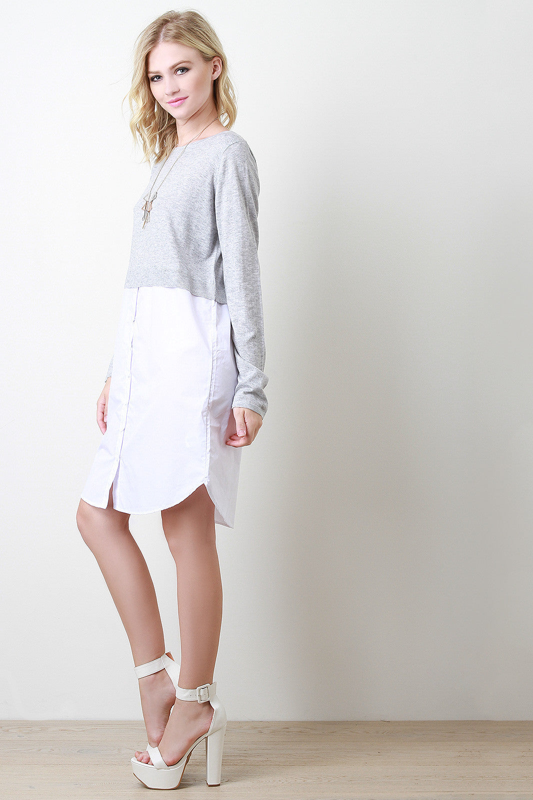 This combo dress features a soft knit upper half with a round neckline, long sleeves, contrasting shirt tail bottom half, snap button-up, and round hemline. Accessories sold separately. 65% Polyester, 20% Acrylic, 20% Nylon, 5% Wool. Contrast: 65% Polyester, 35% Cotton.