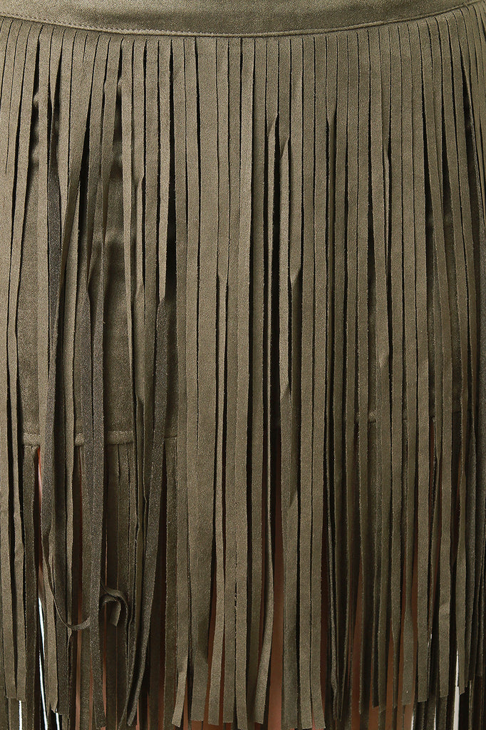 This fringe design, wide waist band, and rear zipper closure. Accessories sold separately. 100% Polyester.