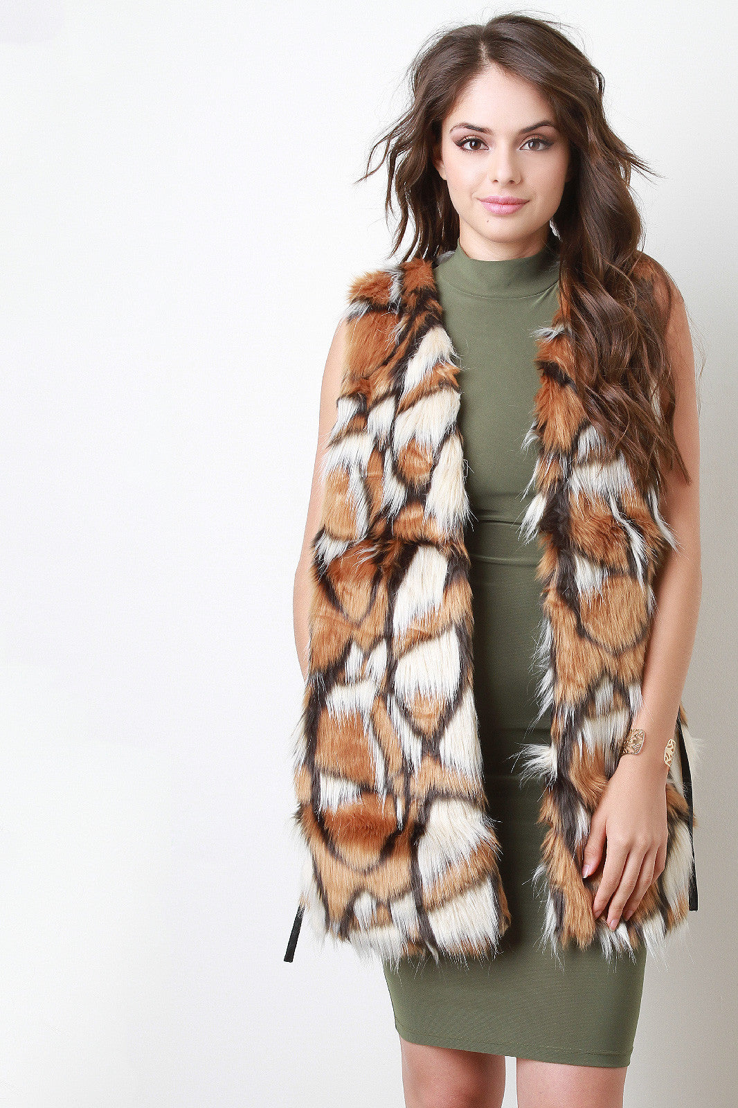 This vest features soft tri-color faux fur design, long line, open front, side belt loops, complete with a self-tie leatherette belt, side pockets, and fully lined. Accessories sold separately. 70% Polyester, 30% Spandex. Contrast: 100% Polyester.