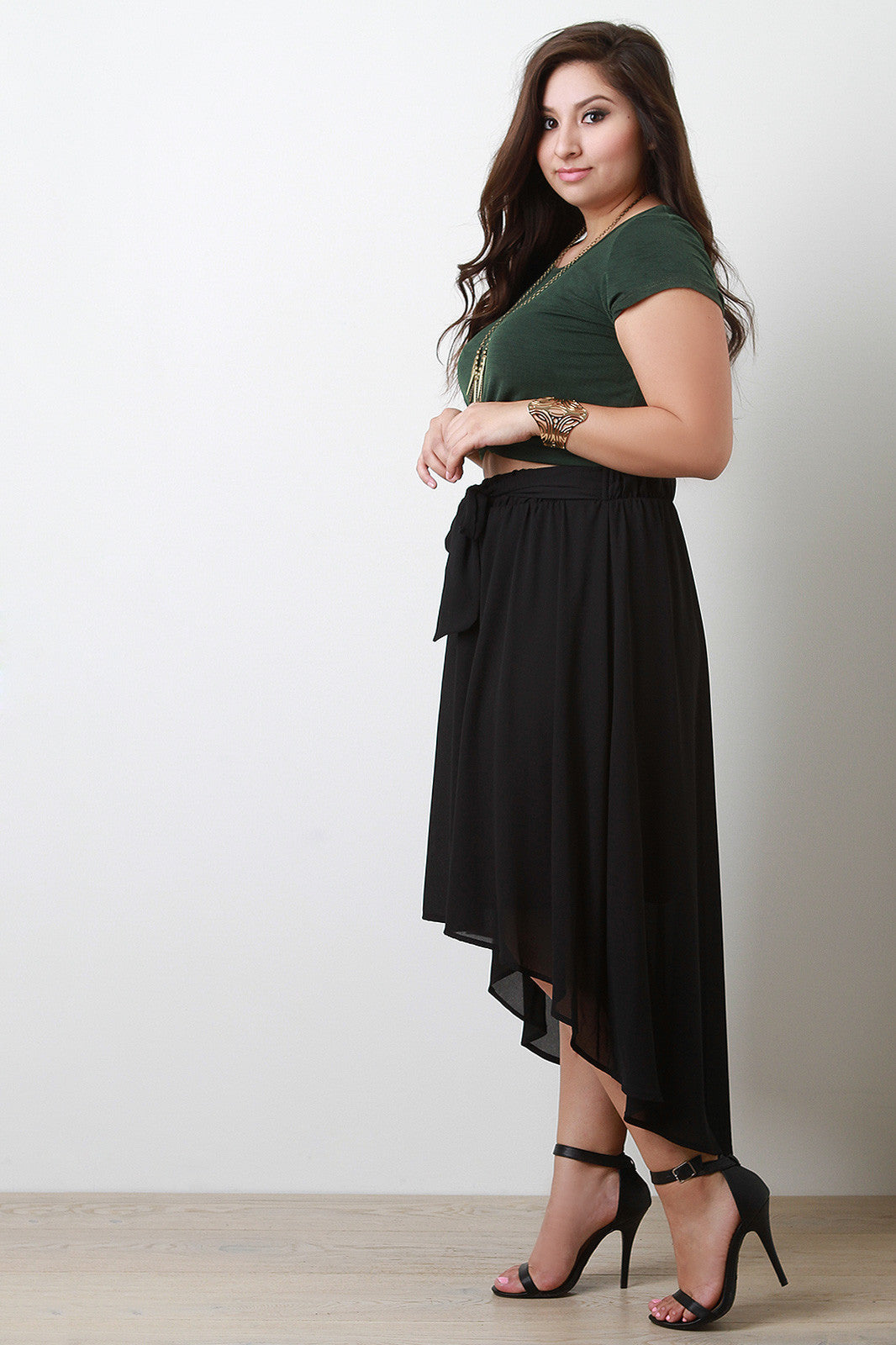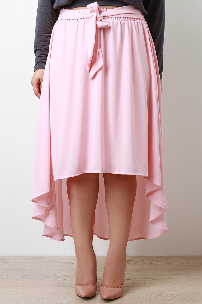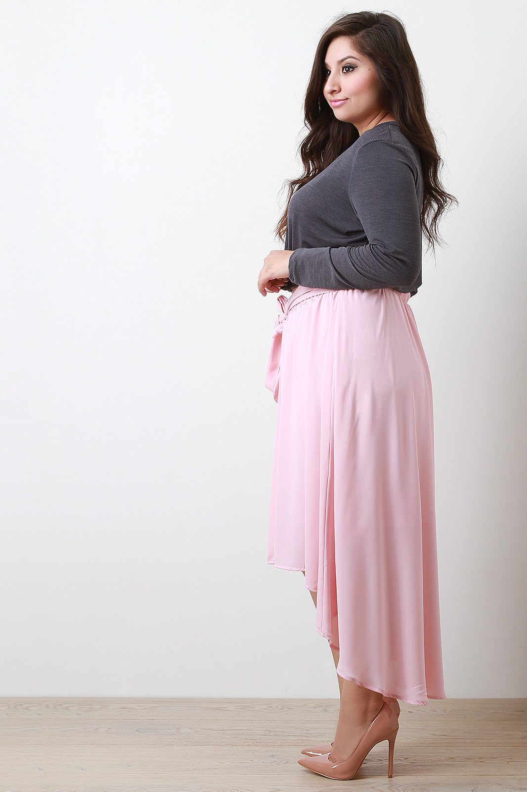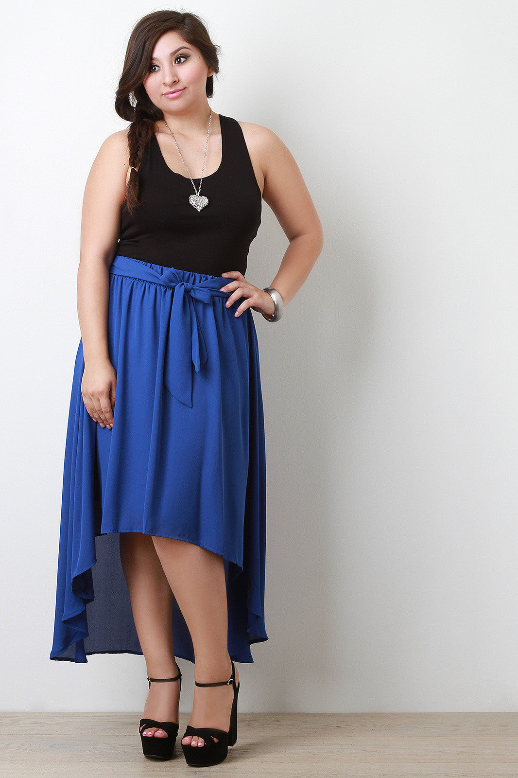 This plus size elasticized maxi skirt has a high-low hem, featuring a mini skirt lining. It is flowy construction with a self tie sash on the front. Accessories sold separately. Self: 100% Polyester. Lining: 100% Polyester.