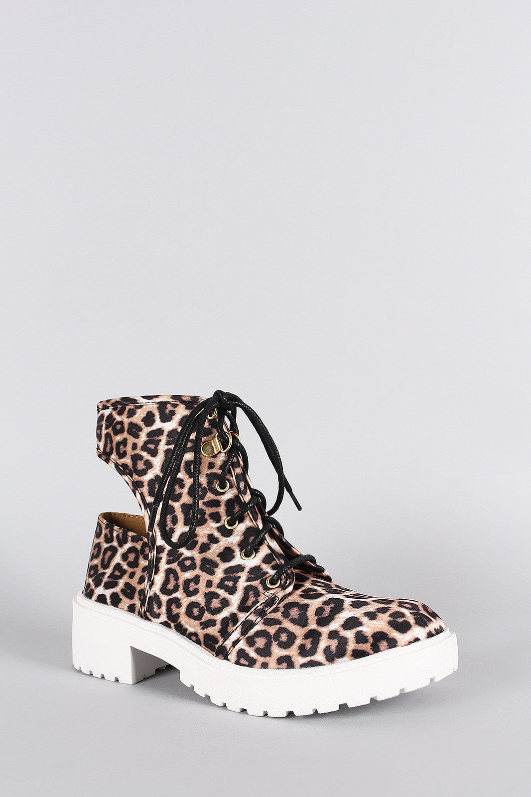 Qupid Leopard Round Toe Lace Up Cutout Booties
