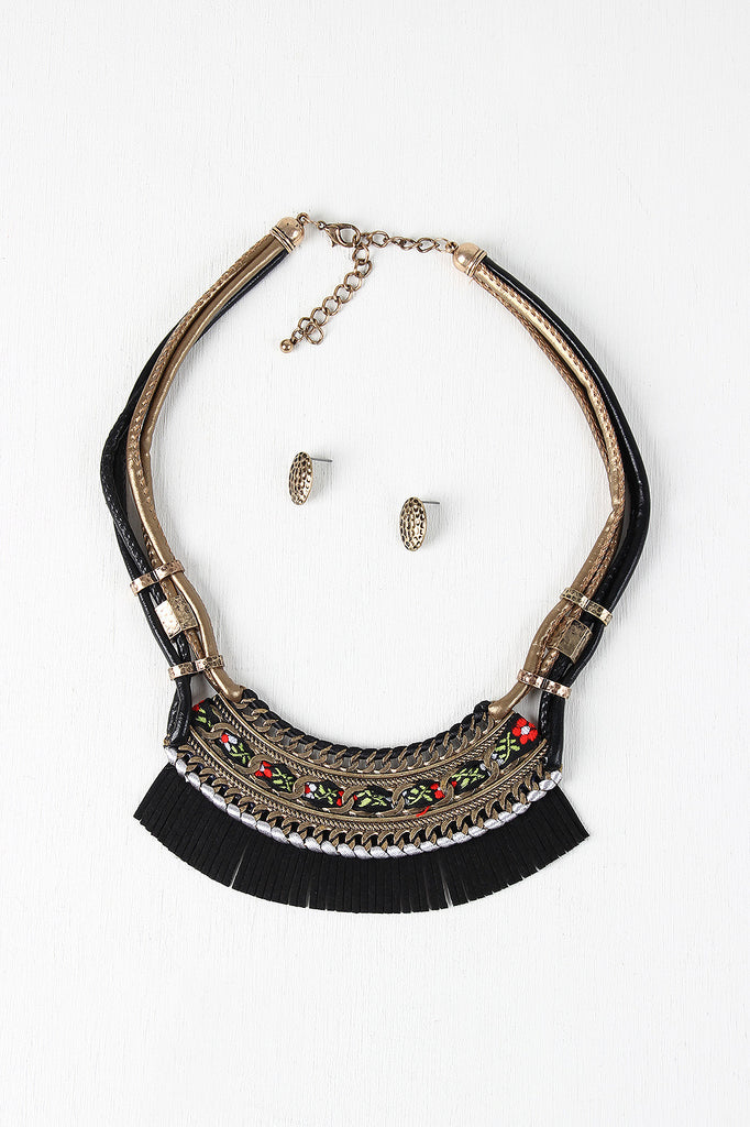 This tribal-inspired statement fringe , and hammered metallic accents. Finished with vegan leather cords, adjustable lobster hook closure, and matching earrings.