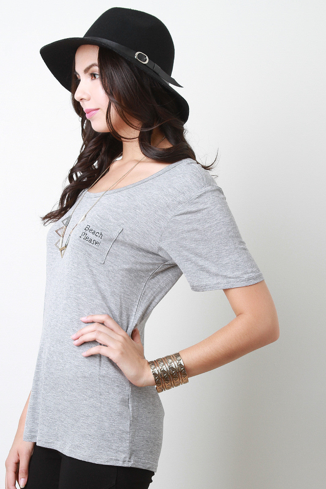 This jersey knit tee features a round neckline, short sleeves, relax fit, and left breast pocket with "Beach Please" embroidery. Accessories sold separately. 95% Modal, 5% Spandex.