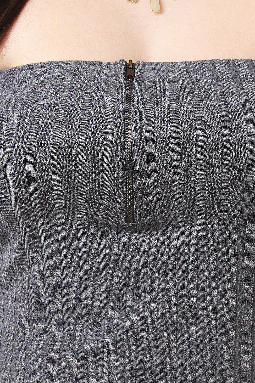 This plus size midi dress is strapless curve hugging bodice; featuring a heathered look throughout with a vertical rib knit design. Finished with a front zipper. Accessories sold separately. 73% Polyester. 22% Rayon. 5% Spandex.