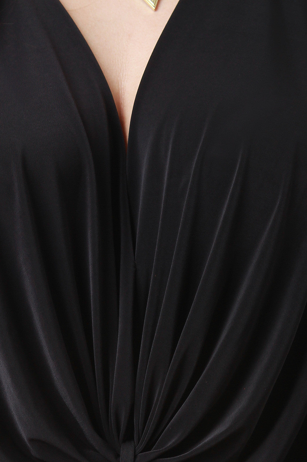 This dress features a smooth fabric with a slight sheen, draped v-neck front with knotted center, and three-quarters dolman sleeves. Accessories sold separately. Made in U.S.A. 96% Polyester, 4% Spandex.