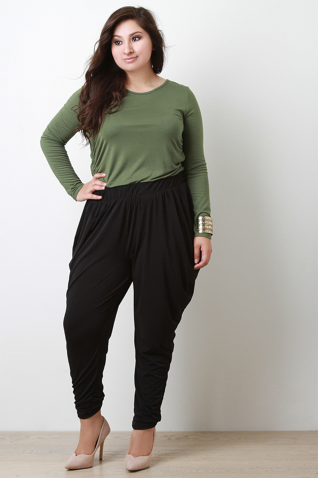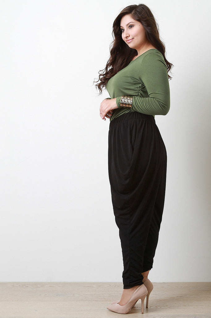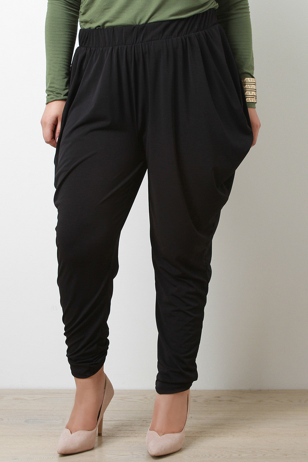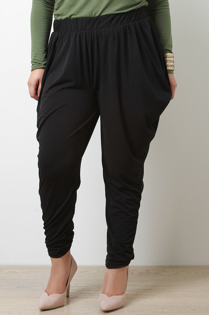 pants featuring an smooth flowy fabric, baggy hip design, and tapered legs. Finished with elastic ruched waistband. Accessories sold separately. Made in U.S.A. 96% Polyester, 4% Spandex.