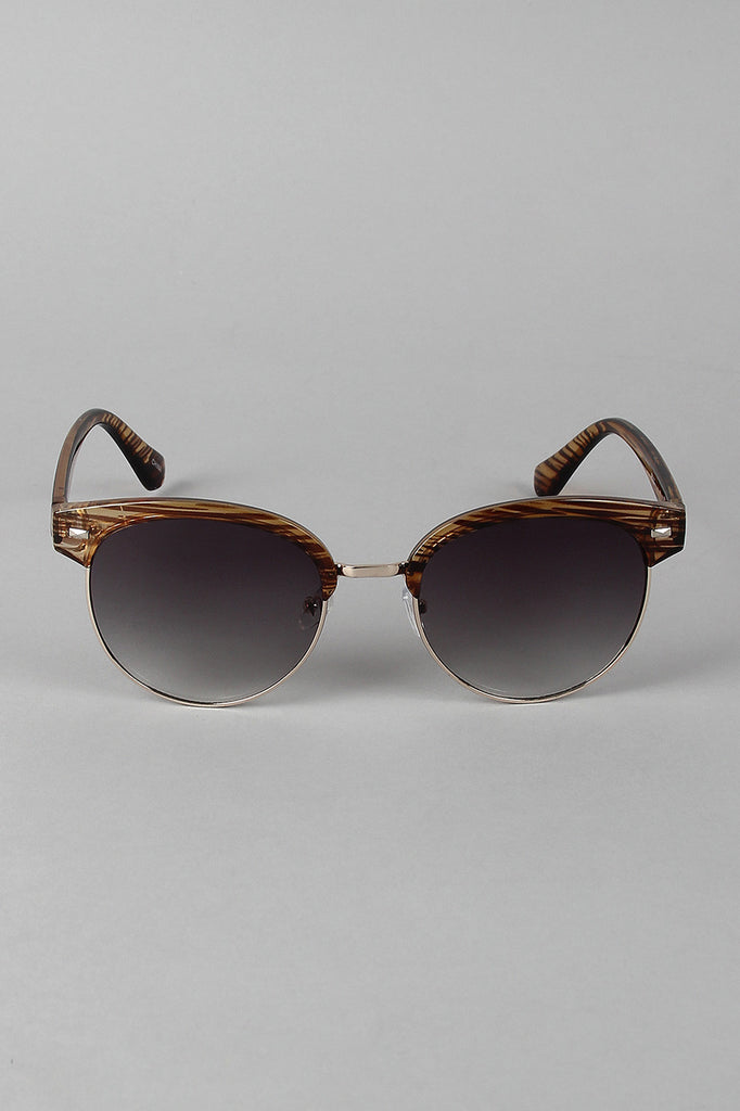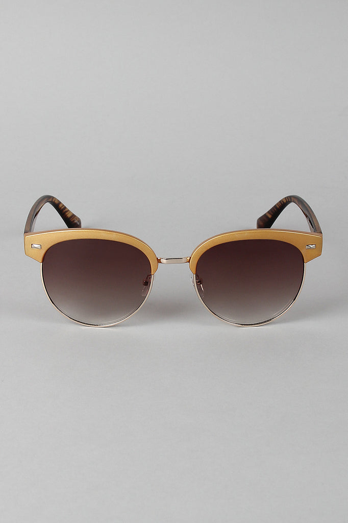 These clubmaster-style sunglasses feature a plastic brow, metallic bottom frame, and round gradient lenses.