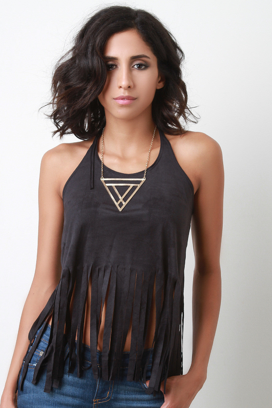 This sleeveless top features a round neckline, self-tie halter back closure, and long fringe hemline. Accessories sold separately. Made in U.S.A. 92% Polyester, 8% Spandex.