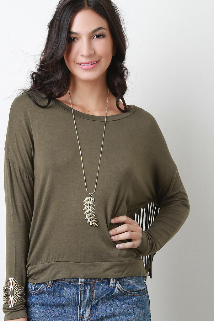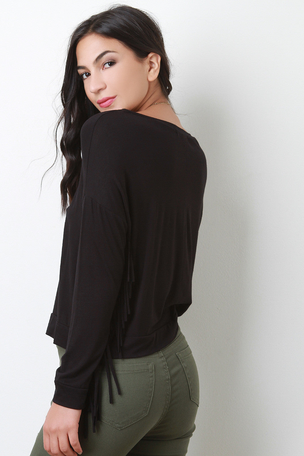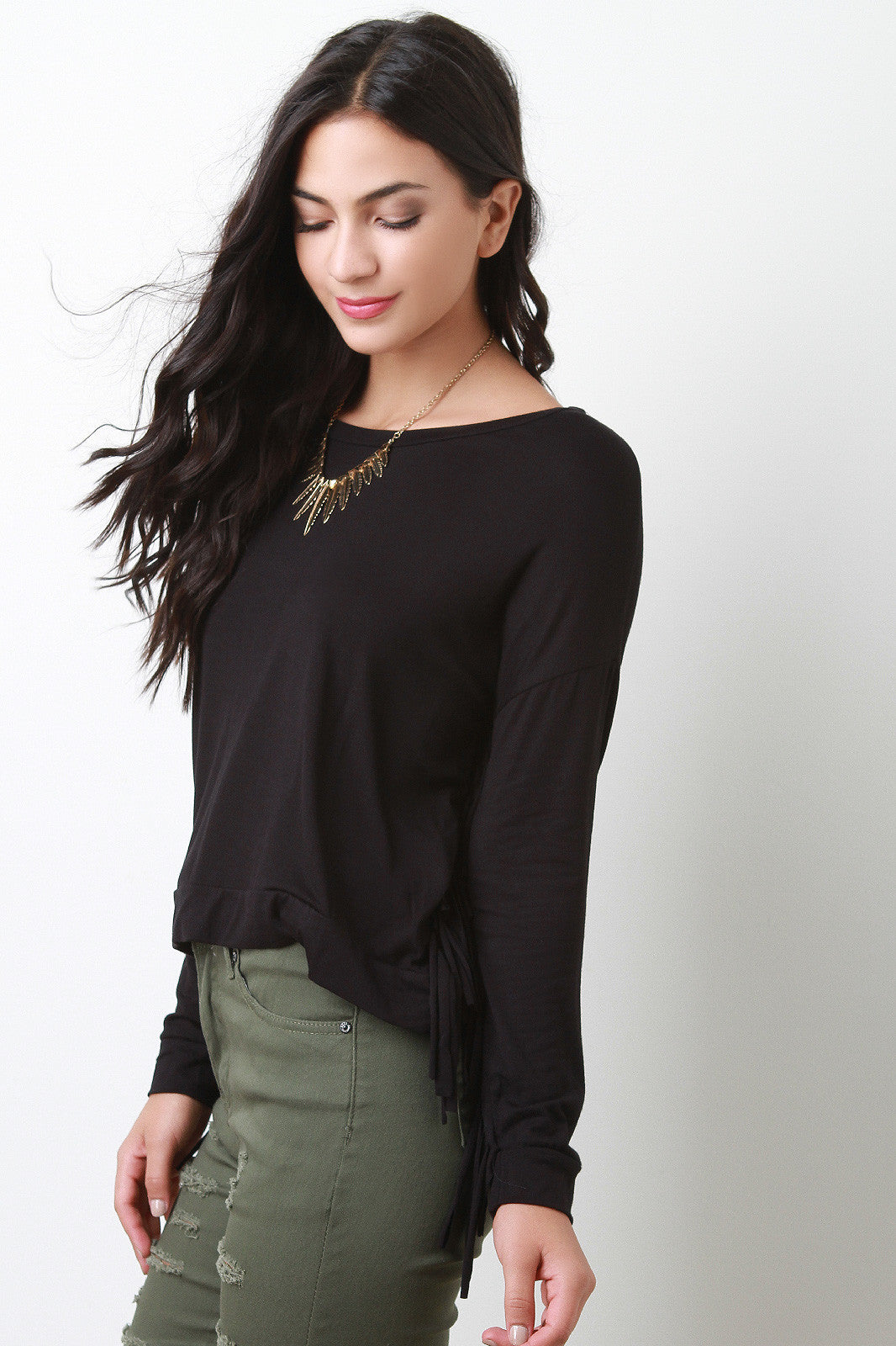 This lovely fringe panel trim, rounded neckline, and banded waistline. Accessories sold separately. Made in U.S.A. 95% Rayon, 5% Spandex.