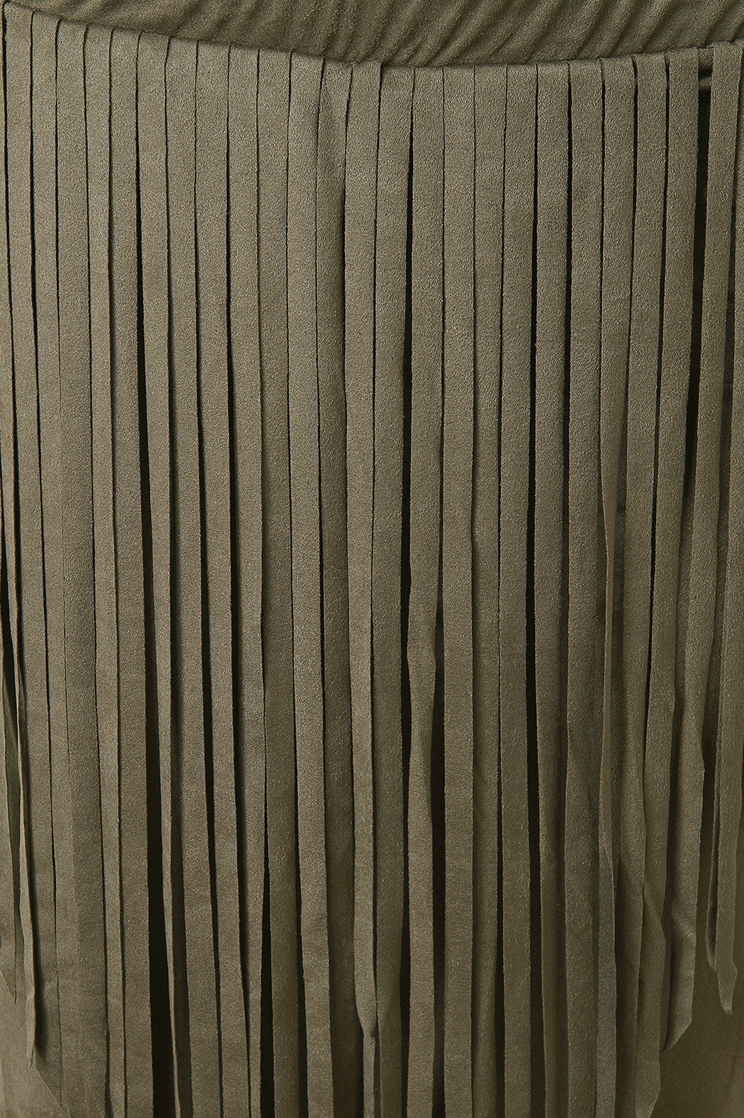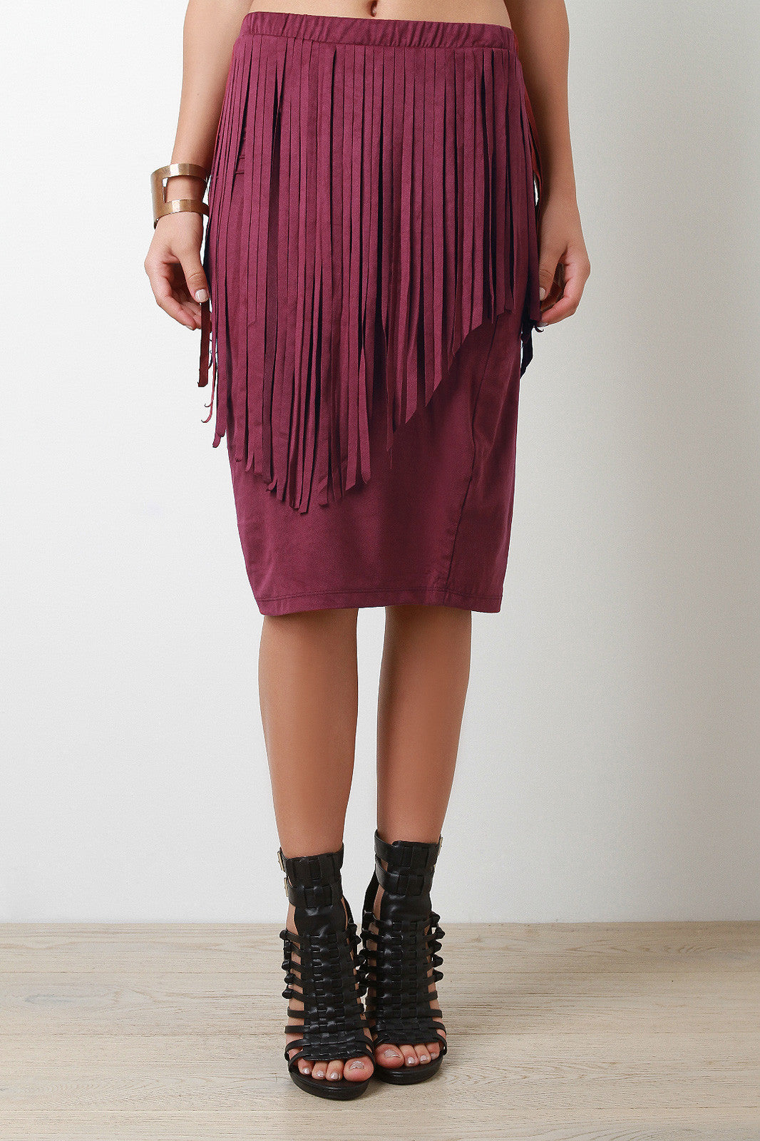 This vegan suede skirt features an elasticized waist, long cascading fringe top tier, and knee length skirt. Accessories sold separately. Made in U.S.A. 90% Polyester, 10% Spandex.