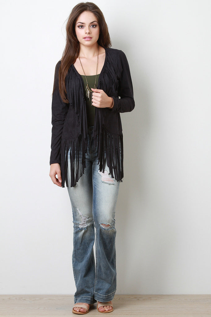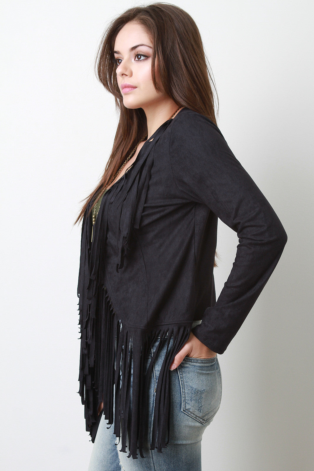 This vegan suede jacket features open front, long sleeves, and finished with fringe accent. Accessories sold separately. Made in U.S.A. 92% Polyester, 8% Spandex.