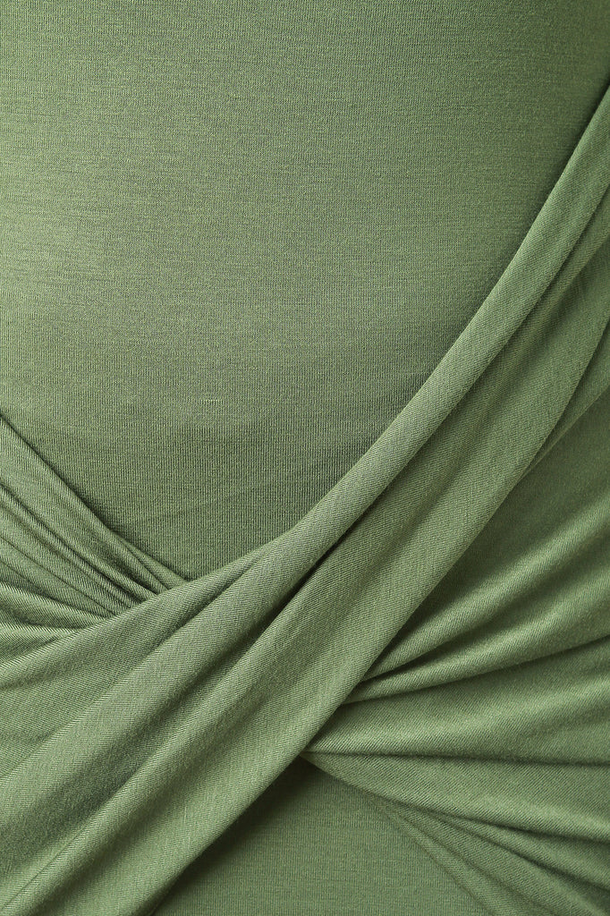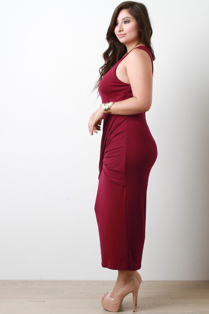 This chic plus size jersey knit maxi dress features a round neckline, sleeveless construction, and draped twisted front sash design. Accessories sold separately. Made in U.S.A. 95% Rayon, 5% Spandex.