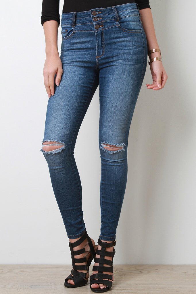 These jeans feature dark denim with light faded design, cutouts at knees, five belt loops, functional five-pocket design, zipper fly with triple button closure, and finished with taper cut. Accessories sold separately. 80% Cotton, 19% Polyester, 1% Spandex.