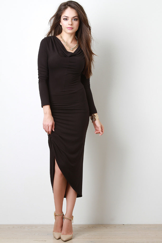 This jersey knit dress features a cowl neckline with center seam, long sleeves, stretchy sculpture fit, high waisted cinched seam, elasticized ruched side and finished with an asymmetrical midi length hemline. Accessories sold separately. Made in U.S.A. 96% Rayon, 4% Spandex.