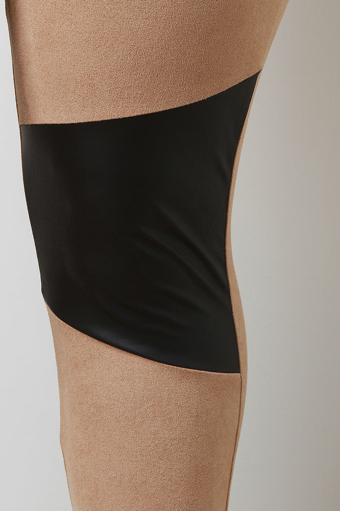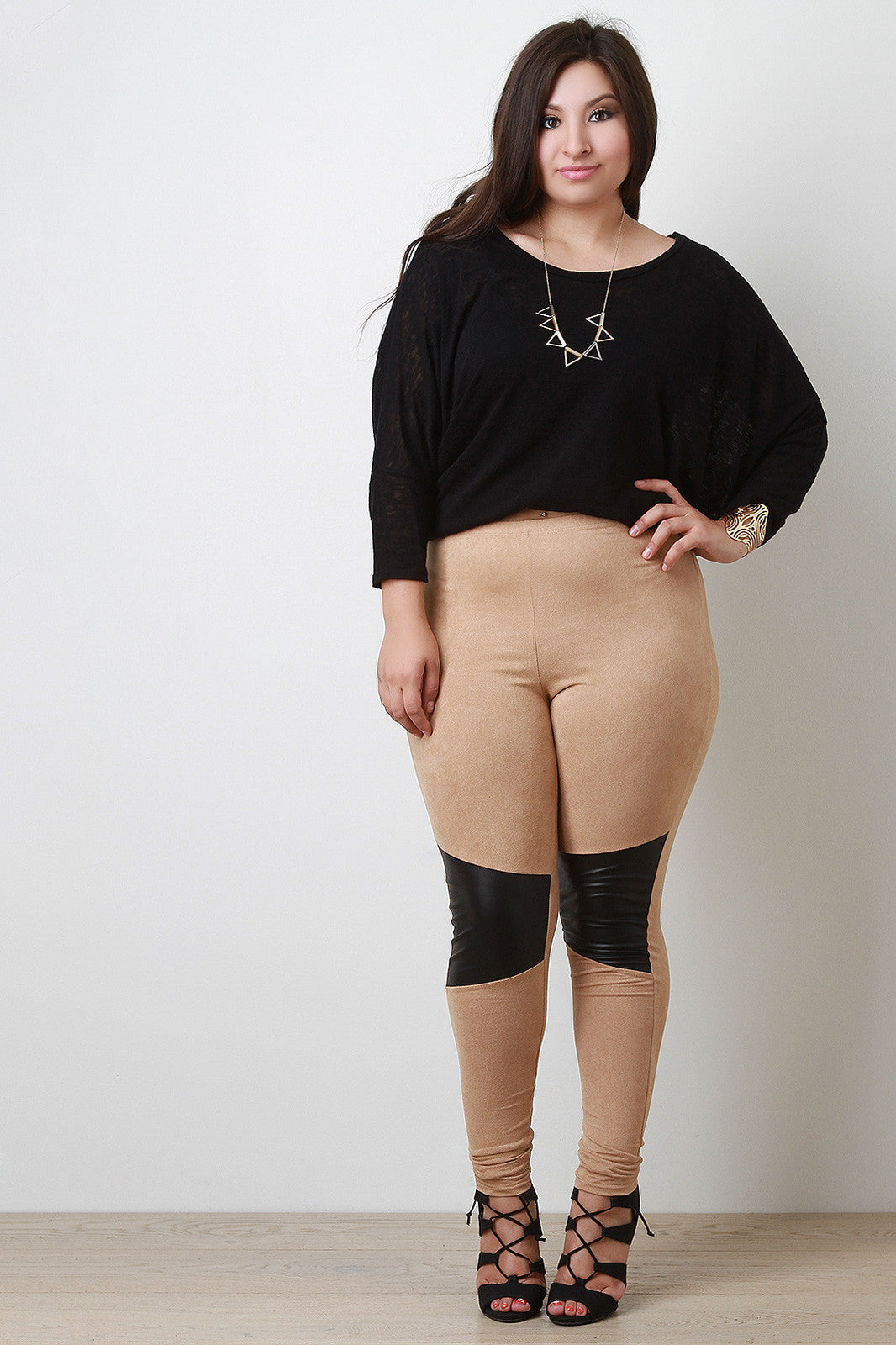 Plus size faux leggings with elasticized waist and vegan leather knee patches. Accessories sold separately. Made in U.S.A. 95% Polyester, 5% Spandex.