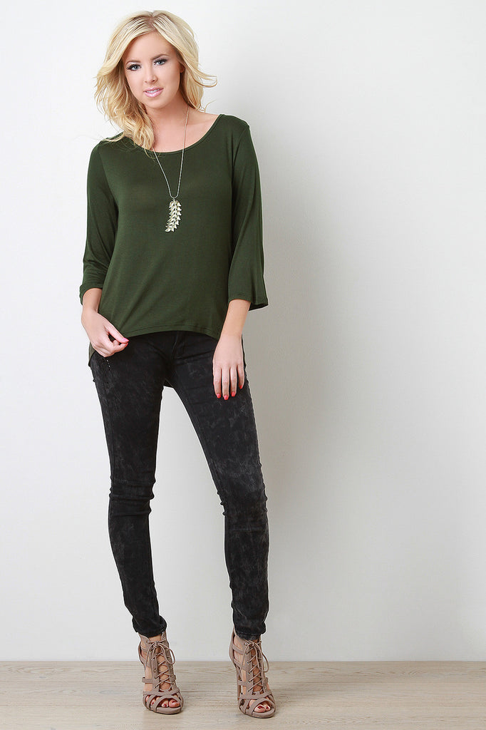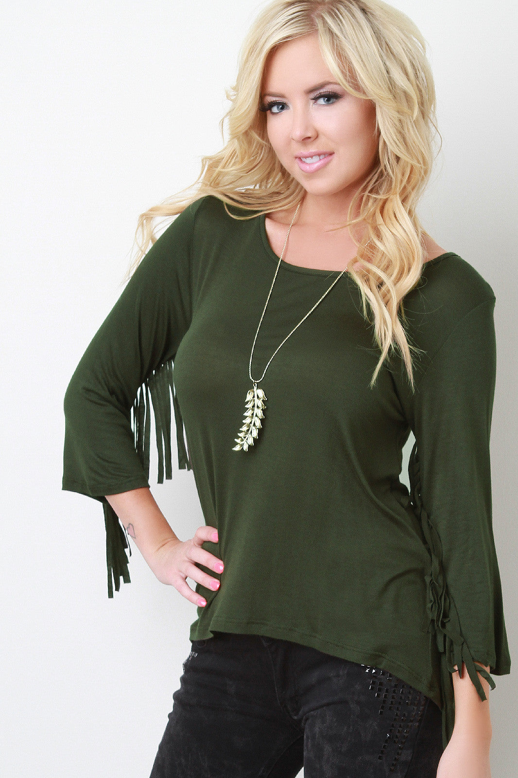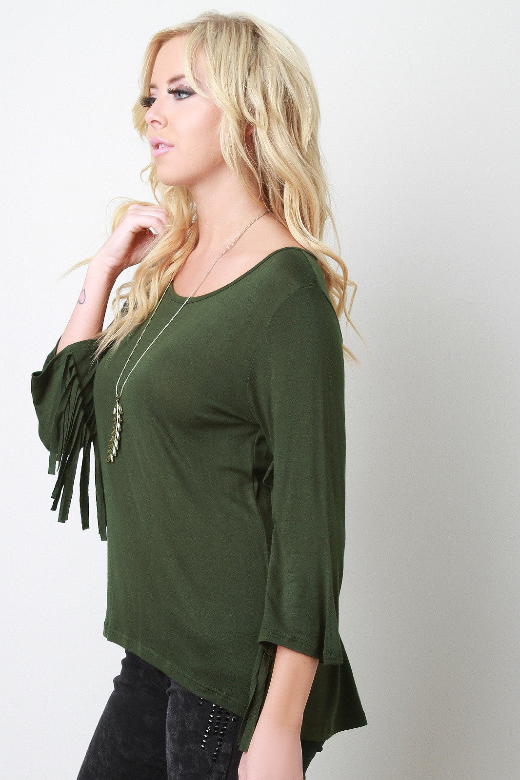 This long sleeve top features soft knit, round neckline, fringe accented sleeves, and finished with slight high-low hemline. Accessories sold separately. 95% Rayon, 5% Spandex.