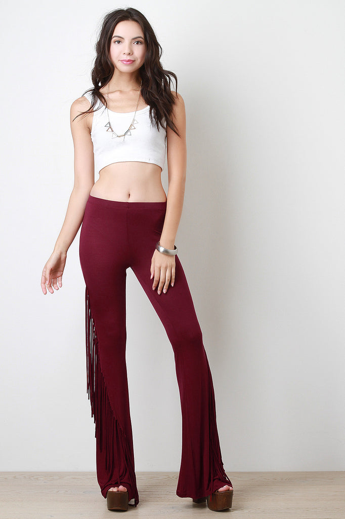 These fashionable pants feature a jersey knit fabrication, elasticized waistline, fringe accent legs, and finished with sculpture fit to flare bell bottoms. Accessories sold separately. 95% Rayon, 5% Spandex.