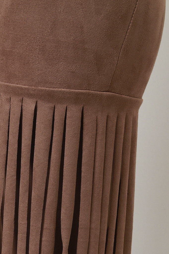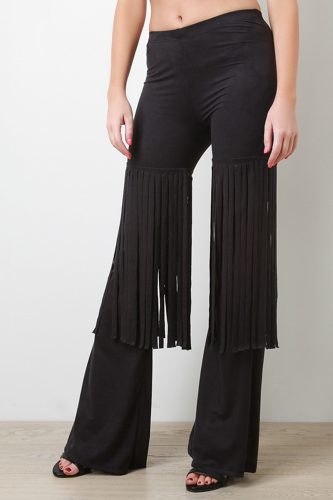 These trendy fringe accent legs, and finished with sculpture fit to flare bell bottoms. Accessories sold separately. 92% Polyester, 8% Spandex.