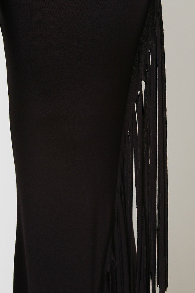 These fashionable pants feature a jersey knit fabrication, elasticized waistline, fringe accent legs, and finished with sculpture fit to flare bell bottoms. Accessories sold separately. Made in U.S.A. 95% Rayon, 5% Spandex.