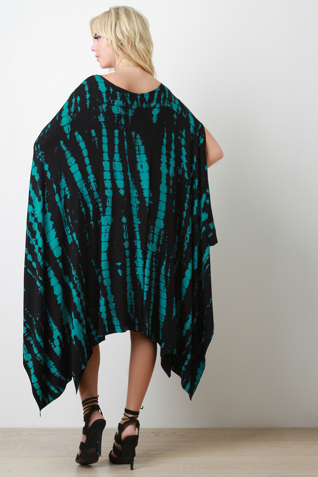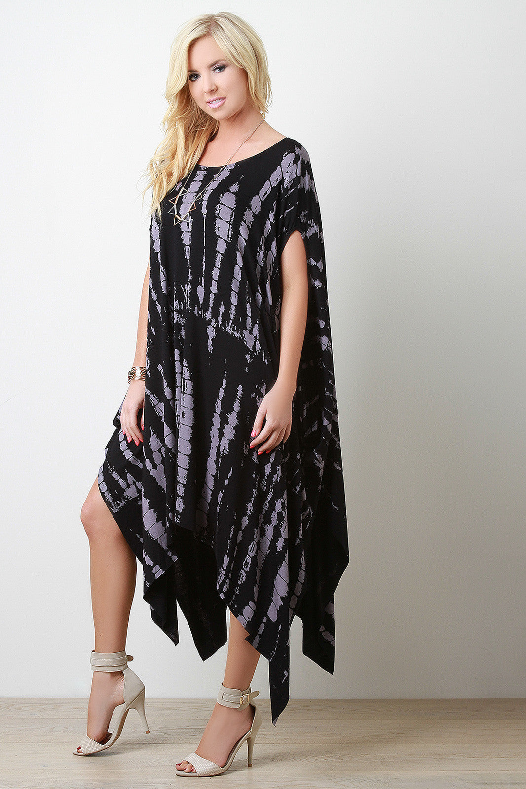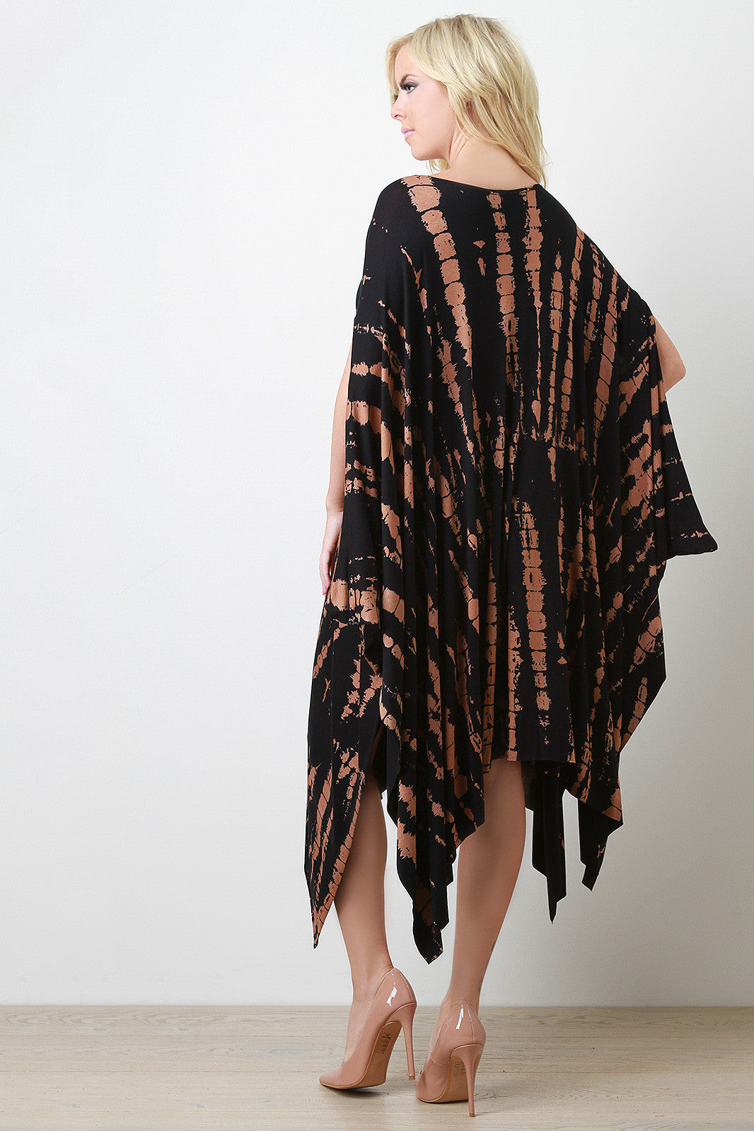 A poncho-style streak print throughout, a round neckline, and dropped shoulders with arm holes. Finished with handkerchief hemline. Unlined. Accessories sold separately. Made in U.S.A. 95% Rayon, 5% Spandex.
