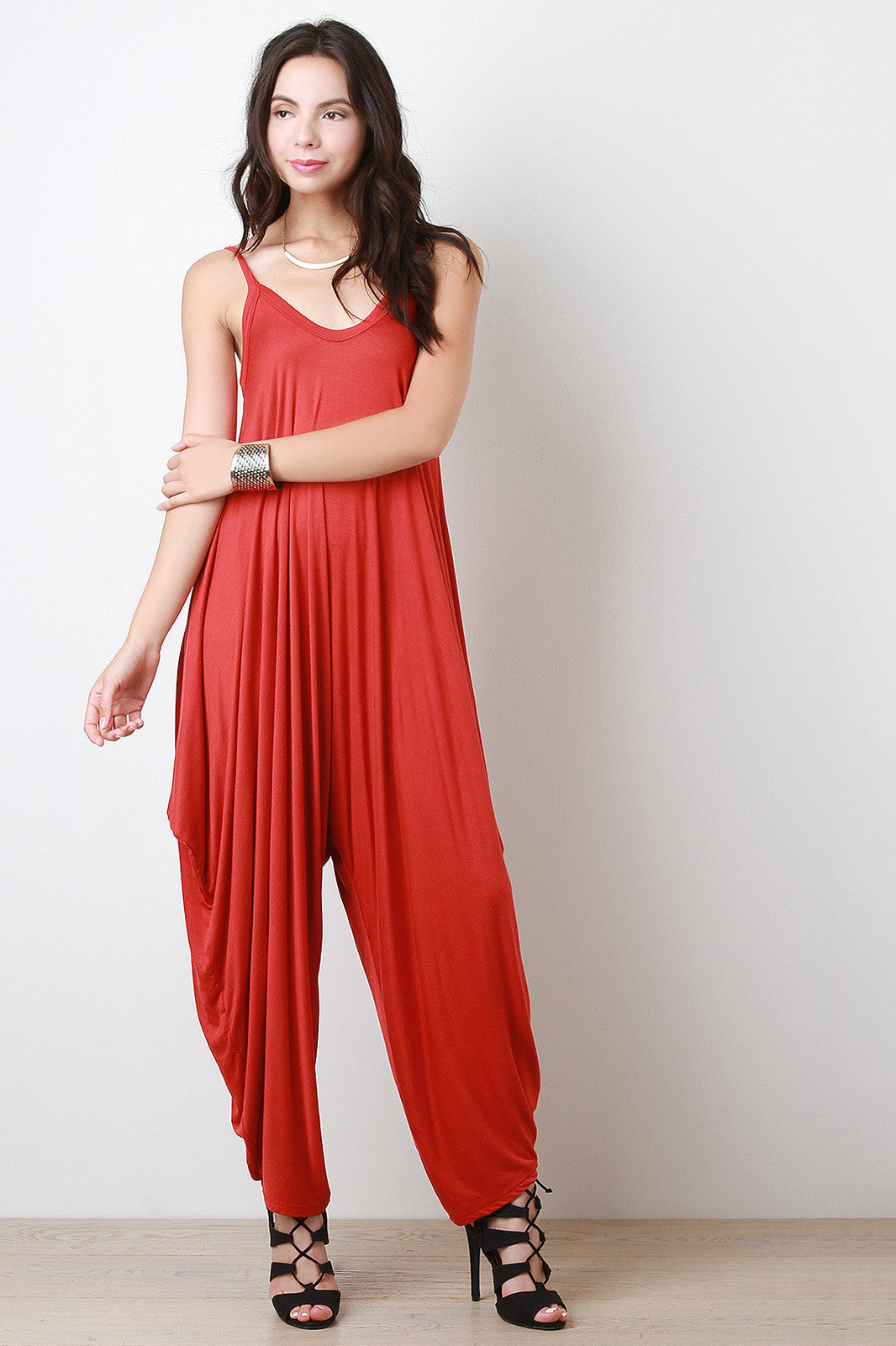 A sleeveless jumpsuit featuring a relaxed draping style, scooped neckline and backline, and narrow shoulder straps. Unlined. Accessories sold separately. Made in U.S.A. 95% Rayon, 5% Spandex.